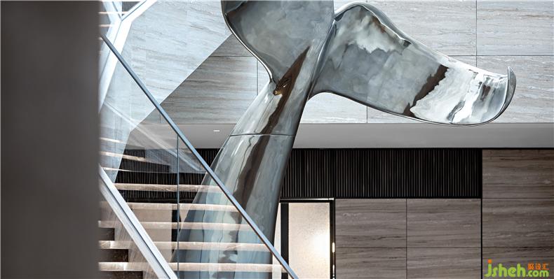 沿樓梯而下,大型鯨魚尾藝術(shù)雕塑,仿佛一頭扎入地下的鯨魚在擺尾,自由且獨一無二,并具有著生生不息的生命力,在靜謐的空間中,演繹著自然藝術(shù)所富有的巨大視覺沖擊力。