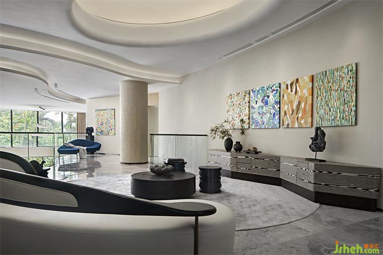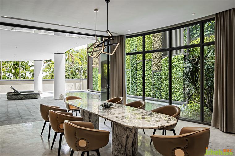 社交中空客廳、西式餐吧、私人影院、酒窖、健身室等功能?chē)@著露天泳池展開(kāi),各空間之間沒(méi)有明顯的界限,彼此形成通暢的流動(dòng),不同生活場(chǎng)景自由切換。