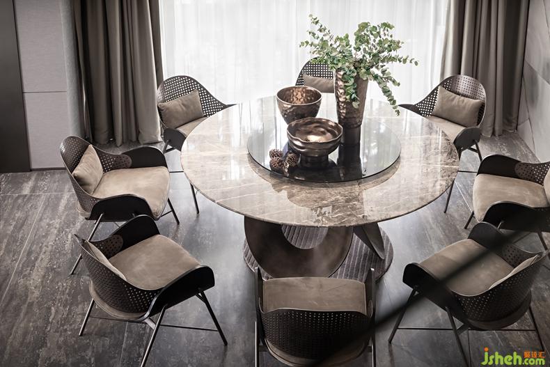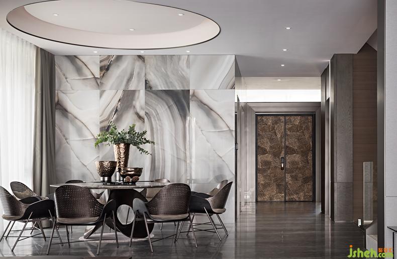 餐廳與客廳開敞聯(lián)合,有效拓展了公共區(qū)域的活動(dòng)范圍與分區(qū)層次,最大化挖掘相鄰場(chǎng)域的滲透與交互,大理石背景亦成為空間共同語匯,回應(yīng)了現(xiàn)代人返樸歸真的訴求。深圳別墅裝飾以個(gè)性銅材餐桌與擺設(shè)營造氣息輕爽的用餐環(huán)境,邊用餐,邊感受藝術(shù)之美,感悟生活之味。