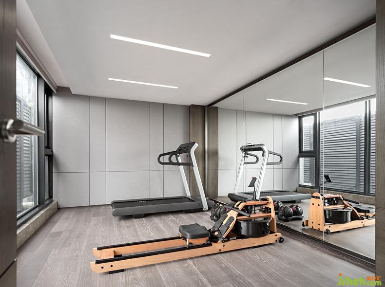 健身房空間通過整體延續(xù)的方式,莫蘭迪色調(diào)及木地板材質(zhì)再次相互滲透、融會貫通。