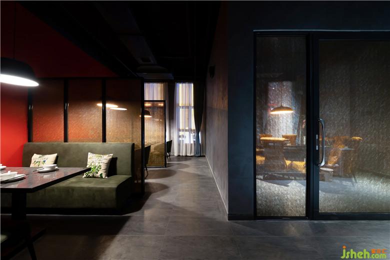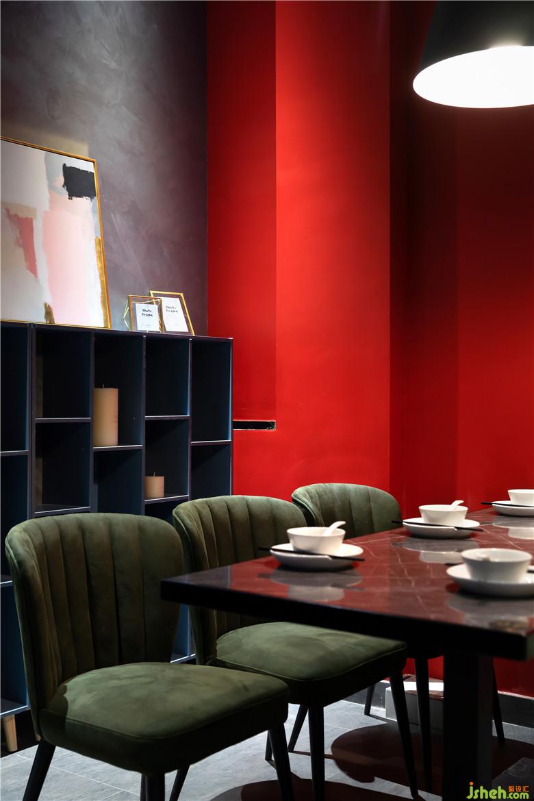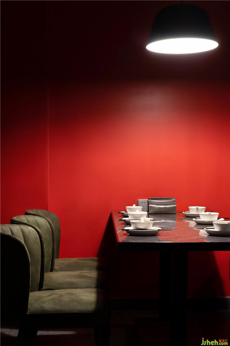 包廂墻面區(qū)域采用和一層空間同樣的材料,卡座吧臺區(qū)采用蛋殼光利物浦紅,室內(nèi)設(shè)計師做了一個跳色區(qū)分,打破深色墻面帶來的沉默感,營造出搶眼的墻面層次,豐富空間色彩。