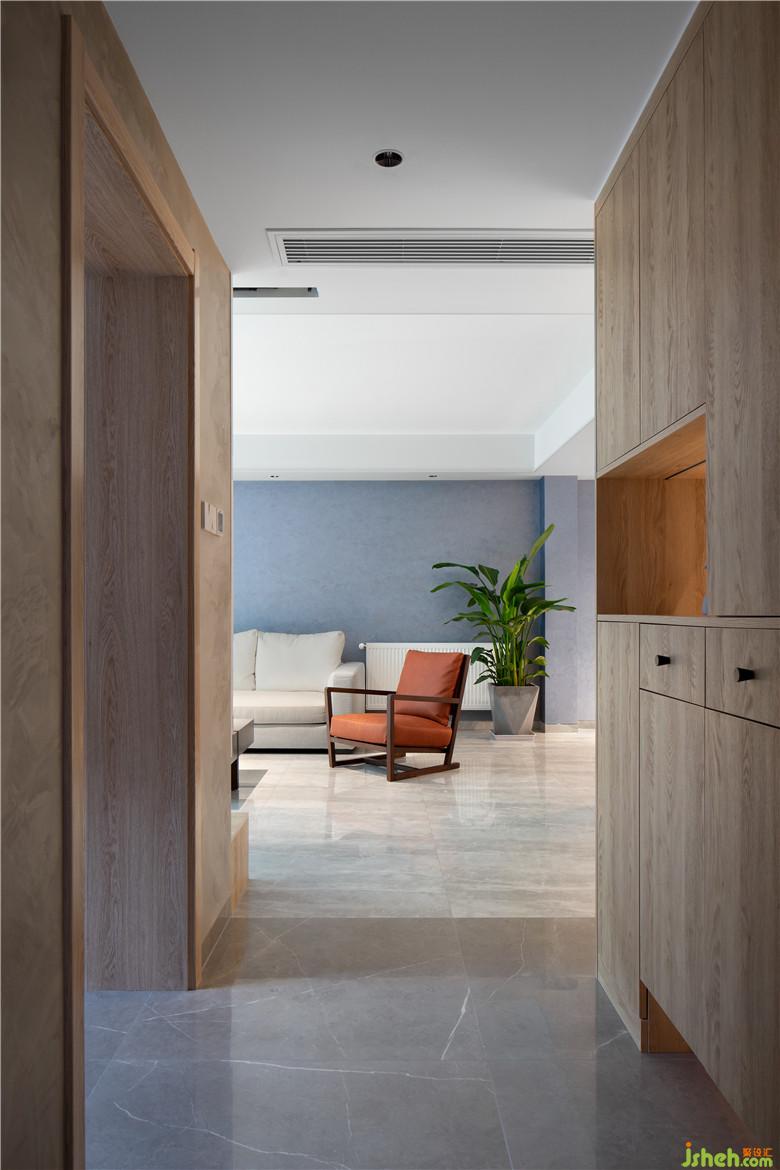 入戶(hù)右手邊實(shí)現(xiàn)通頂木質(zhì)柜、便于存放隨手零雜物品、換鞋等進(jìn)出門(mén)需求。