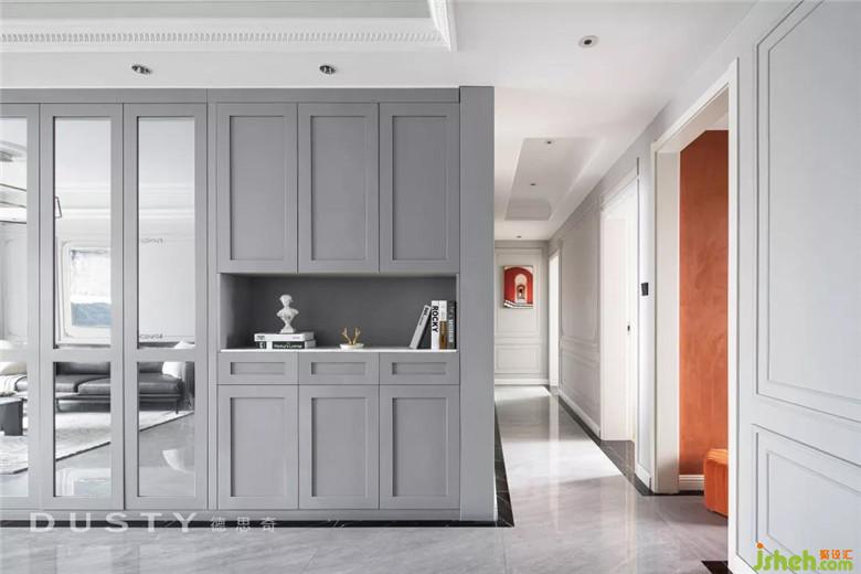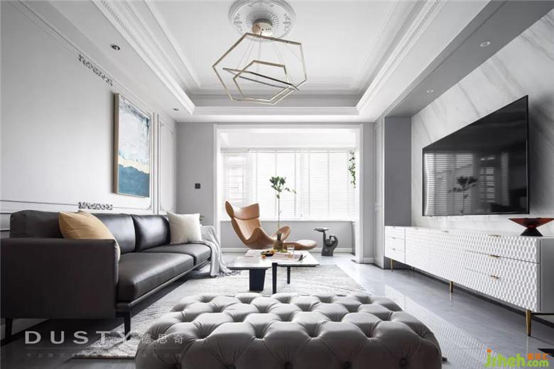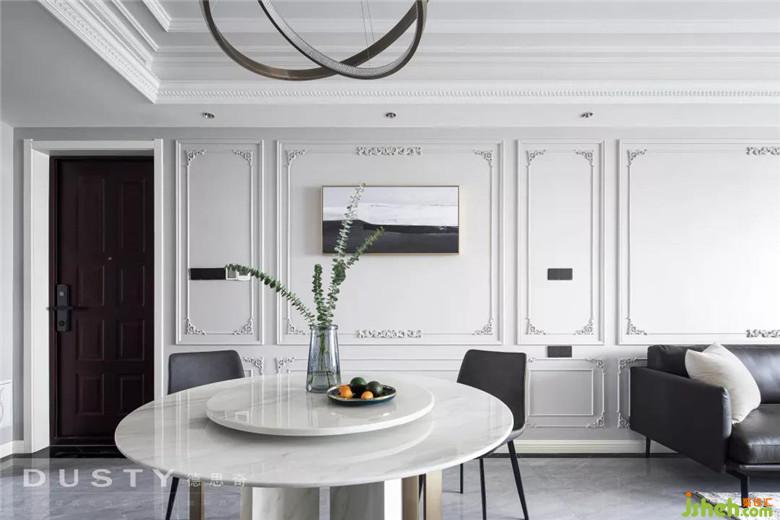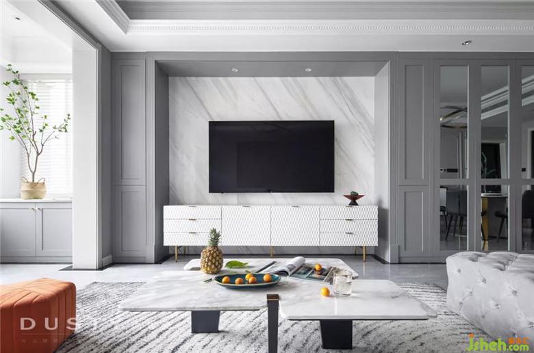 客餐廳一整面的組合柜,電視背景墻的大理石藝術(shù)紋理搭配的灰色拼框柜門造型,點(diǎn)亮了日常里的精致細(xì)膩。