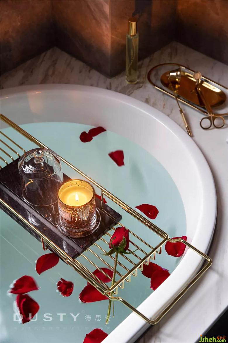 玫瑰花瓣,香薰?fàn)T臺, 帶去了家門外的疲憊與喧囂,此刻只有美好。主衛(wèi)的空間并不大大,因而潔具都是嵌入式的,同時(shí)方便后期衛(wèi)生的打理。