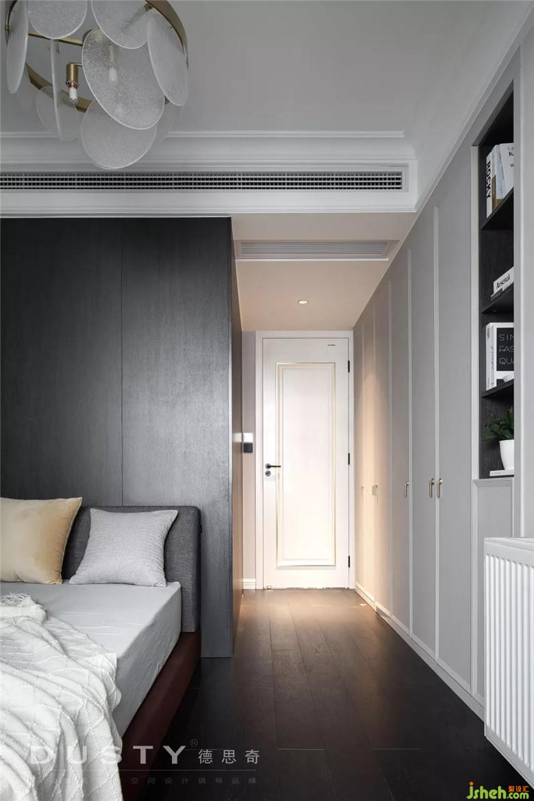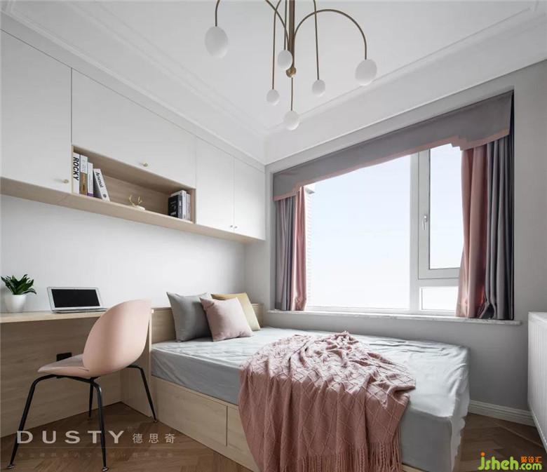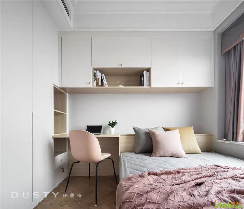 榻榻米的空間留給父母過來住,在這里設(shè)置了一個(gè)組合柜,讓書桌、床、衣柜、吊柜形成一個(gè)整體。裝修公司用經(jīng)典的白色和木色搭配顯得空間溫馨明亮。
