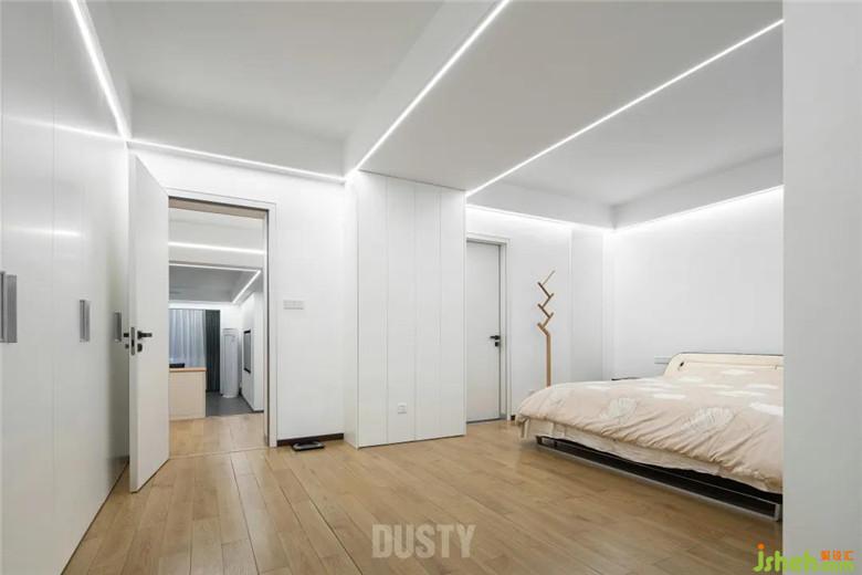 主臥房門裝修公司改為朝向客廳,使之南北空氣形成對流。整個空間無多余的造型,滿墻衣柜從地到頂無接縫,空間得到最大釋放,收納功能做到最大化。