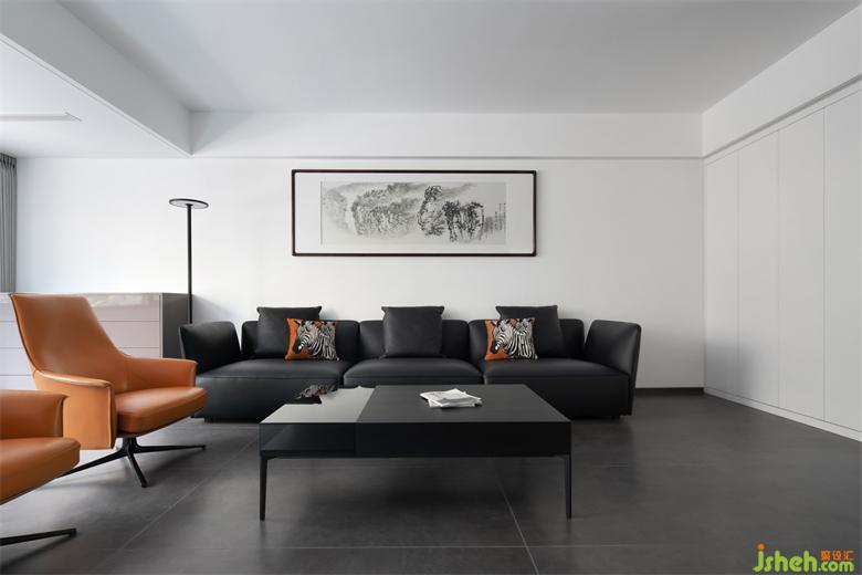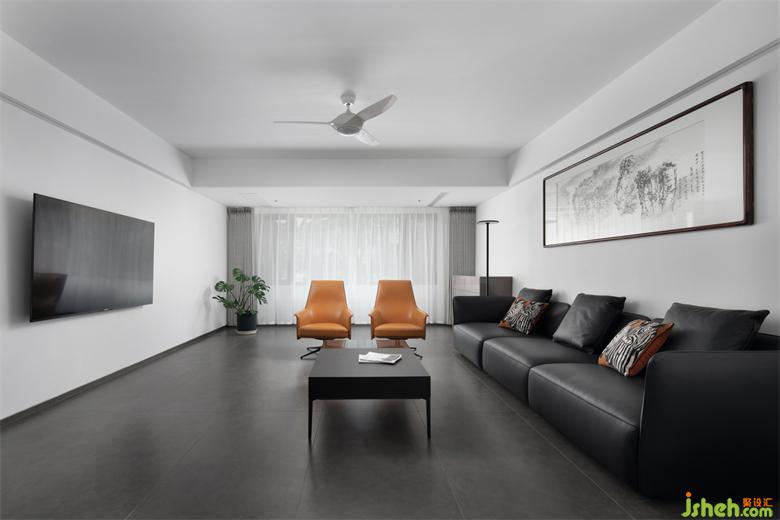 我們將整體的色調(diào)定為白色,質(zhì)感又寧靜。一盞吊扇燈,增添許多生活的氣息。家裝設(shè)計桔色單人椅配上黑色的沙發(fā)和灰色地板,高級感撲面而來。地面與立面使用相似色調(diào)統(tǒng)一質(zhì)感,空間深度、廣度得以延伸。