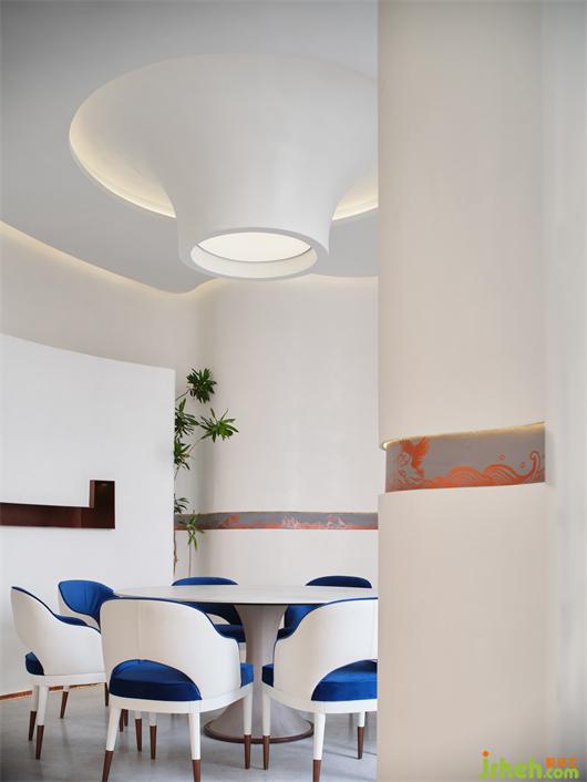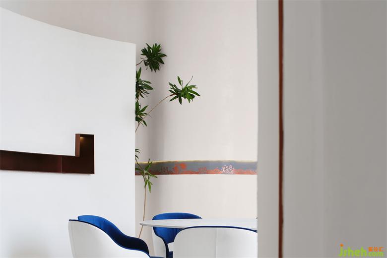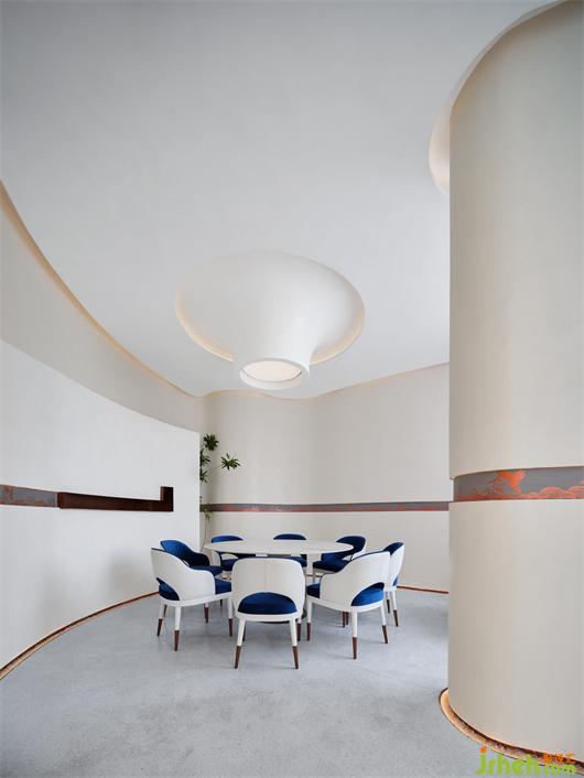 會所設計用紫銅板色呈表曲之色,用不銹鋼水波紋呈表水之態(tài),用水滴造型呈表水之形。