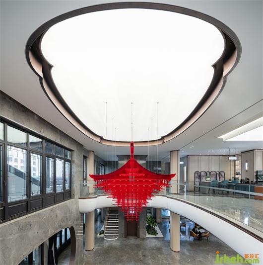 售樓處設(shè)計(jì)透明的中國紅空中樓閣象征云歸故里的形而之上與形而之下。