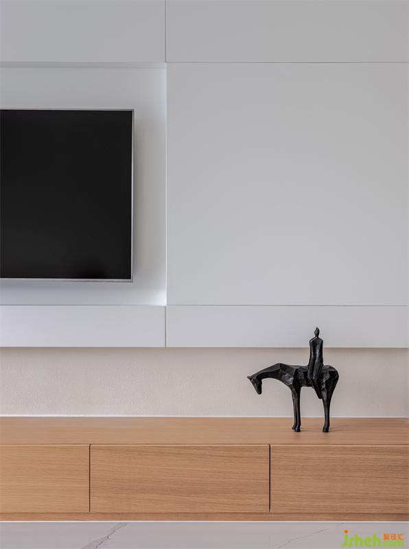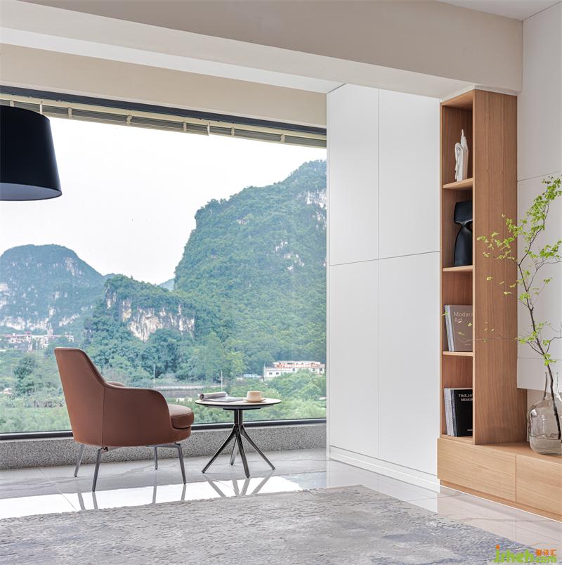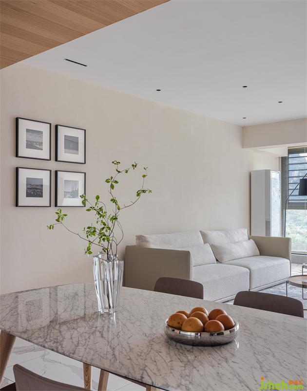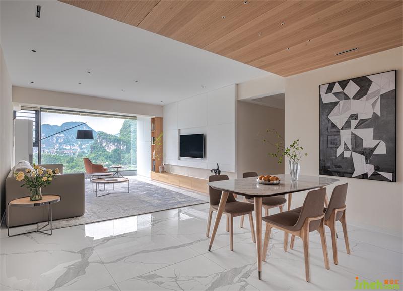 將客廳的外陽(yáng)臺(tái)進(jìn)行改造,使得客廳面積增大,并在臨江的一面采用大面積的固定玻璃窗,使窗外的青山綠水與室內(nèi)的造型裝飾相互映襯。尤其是當(dāng)陽(yáng)光透過(guò)大面積的玻璃窗灑落室內(nèi),光影隨著時(shí)間的推移在室內(nèi)流淌跳躍,整個(gè)空間仿佛化身為光的藝術(shù)館。而整個(gè)空間采用極簡(jiǎn)無(wú)主燈的照明設(shè)計(jì),把控好燈光的色溫,又將家的氛圍烘托得溫馨浪漫。
