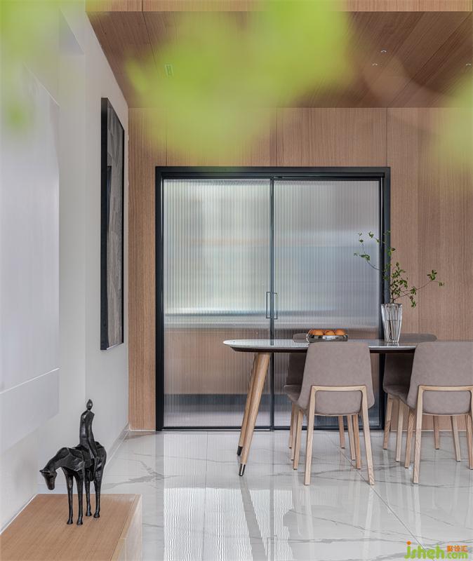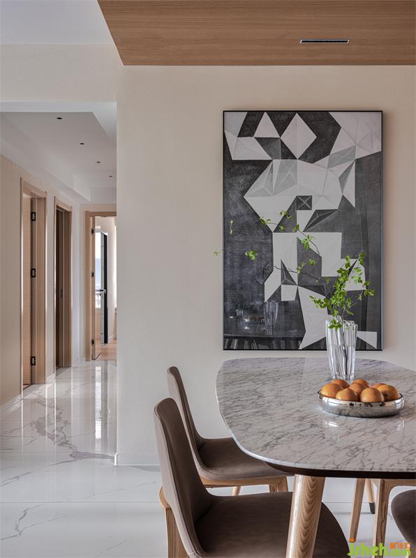 家之所以為“家”,是因?yàn)榧沂切撵`的棲息地,所以最重要的是要讓人有家的歸屬感。而歸家的首要體驗(yàn)在玄關(guān)。用原木打造玄關(guān)墻面,墻上是極簡(jiǎn)風(fēng)格的油畫(huà),瞬間讓人溫暖而心安,給人留下美好的印象。
