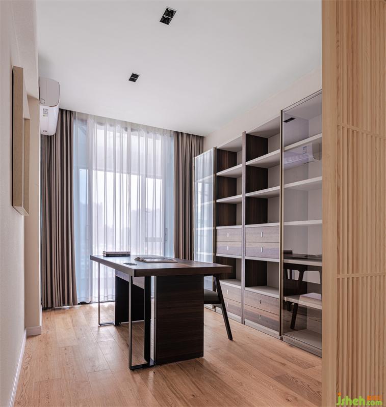 書(shū)房擺放造型簡(jiǎn)潔大方的書(shū)桌和書(shū)柜,沒(méi)有過(guò)多的裝飾,讓人專(zhuān)心思考,安靜閱讀。