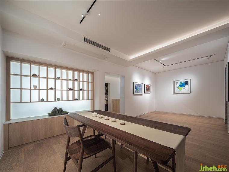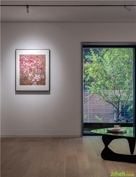 我們拆除了部分墻體,重新規(guī)劃了布局,一層以展示作品為主,也兼部分接待的功能,原來(lái)的廚房改為一個(gè)操作間,把會(huì)客功能放在能看到花園的區(qū)域,展廳設(shè)計(jì)運(yùn)用傳統(tǒng)園林的借景手法,使室內(nèi)外有一個(gè)互動(dòng)。它的二層,規(guī)劃成業(yè)主的工作室、一個(gè)茶室、還有一個(gè)收納畫(huà)材的庫(kù)房。
