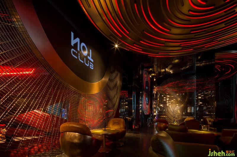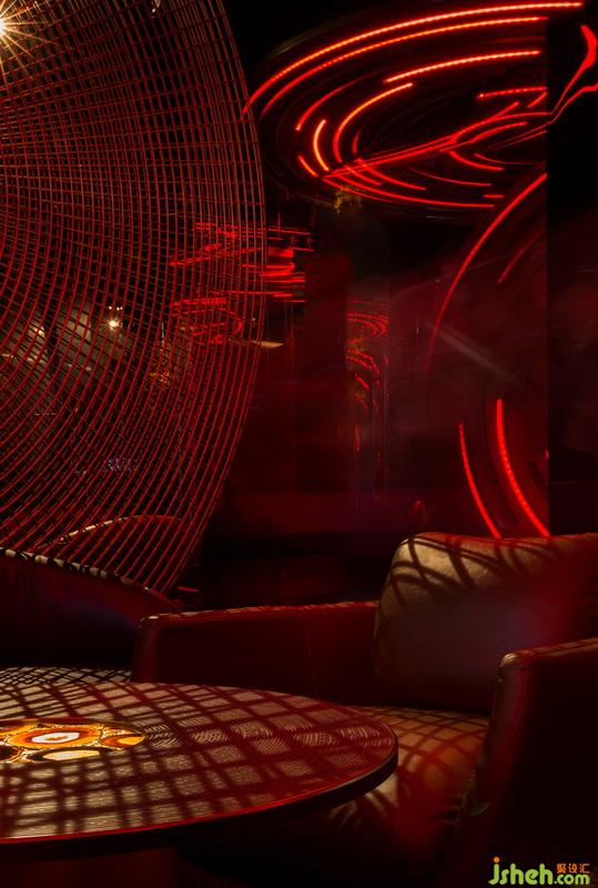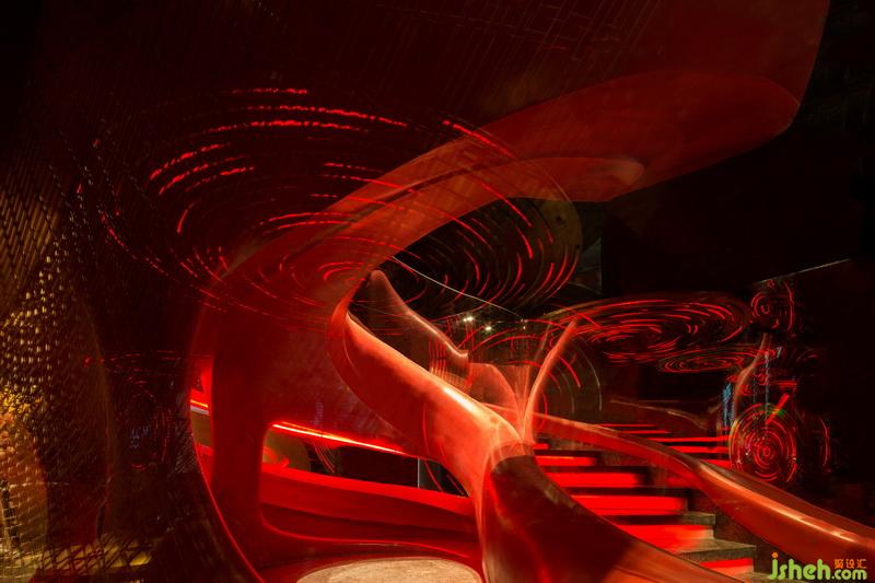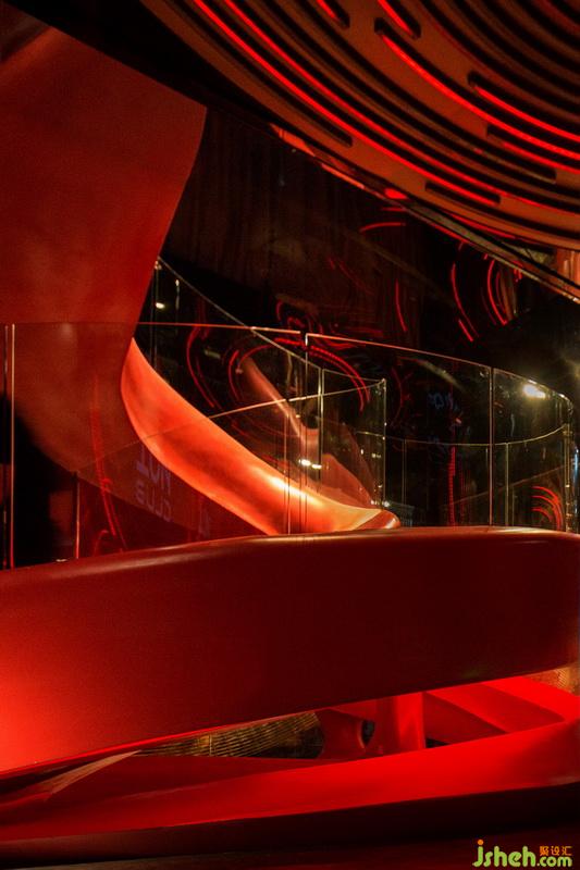 酒吧進(jìn)門就可以看見巨大的“黑膠唱片”飛碟穿插縱橫于整個酒吧外部公共空間。這些飛碟由仿銅不銹鋼制成,飛碟互相重疊交錯,連綿的唱片有高有低,虛實(shí)結(jié)合,飛碟上的燈帶隨著音樂節(jié)奏而變化,帶動著整個空間一起躍動起來。在設(shè)計(jì)上,為了讓體驗(yàn)者能夠體驗(yàn)主廳的氛圍,相應(yīng)的在唱片上增加了LED屏幕,能夠與主廳播放的主題畫面同時顯示。