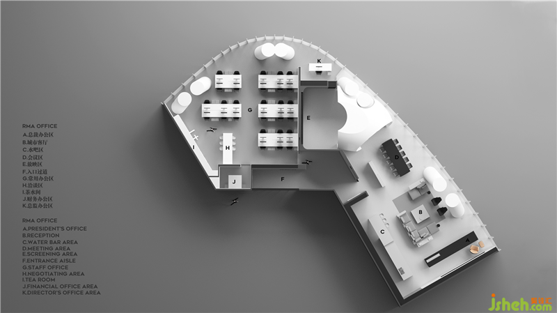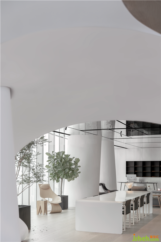 基于辦公室內(nèi)有多個(gè)工作小組,且小組成員需要同時(shí)辦公的情況,此區(qū)域的設(shè)計(jì)旨在提供使不同團(tuán)隊(duì)成員能同時(shí)享用的共享型空間,團(tuán)隊(duì)成員可以在此進(jìn)行不一樣的溝通討論工作,其目的為了能創(chuàng)建一個(gè)能使人真正放松身心,自由工作的辦公空間。一個(gè)有能力吸收辦公行為中,各種變化需求并靈活做出調(diào)整的生動(dòng)多樣的空間氛圍:有彈性,自發(fā)應(yīng)用,具備延展性與適應(yīng)力。辦公室設(shè)計(jì)