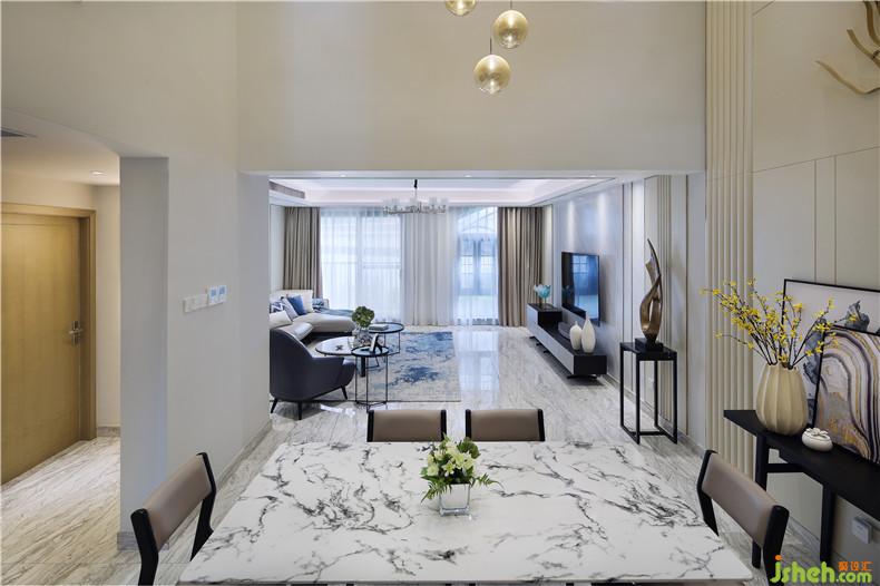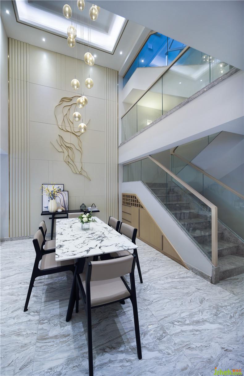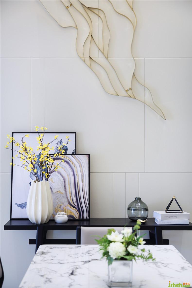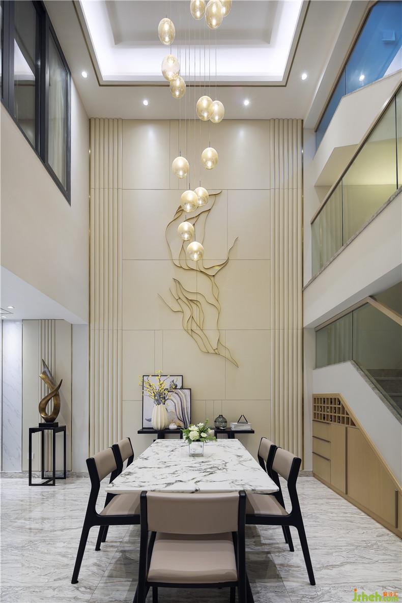 空間設(shè)計理念上主張用豎線條來切分過于矮、扁、寬的立面空間,拉升層高;有規(guī)律的弧形豎條 作為間隔,兩種線條的碰撞讓整體空間既規(guī)整、利落而又不顯呆板。材質(zhì)上選擇皮質(zhì)硬包及金屬線條,精細(xì)工藝為其特征,強調(diào)品質(zhì)感及細(xì)節(jié)的處理。空間搭配上突出硬裝到軟裝的元素延伸,比如地板磚面的水墨質(zhì)感的律動,客廳裝飾畫里的蜿蜒曲線,挑空餐廳背景的鐵藝裝飾掛件呈現(xiàn)的不規(guī)則弧線的相交等等細(xì)節(jié)都強烈?guī)С隹臻g整體的調(diào)性,不為裝飾而裝飾,所有的都是恰到好處的點綴,營造的空間氛圍是非常突出和自然的。