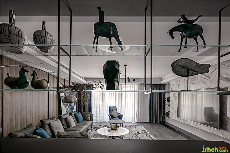 客廳左邊設(shè)計(jì)了玻璃金屬層板與進(jìn)門口鞋柜上方的玻璃層板呼應(yīng)。