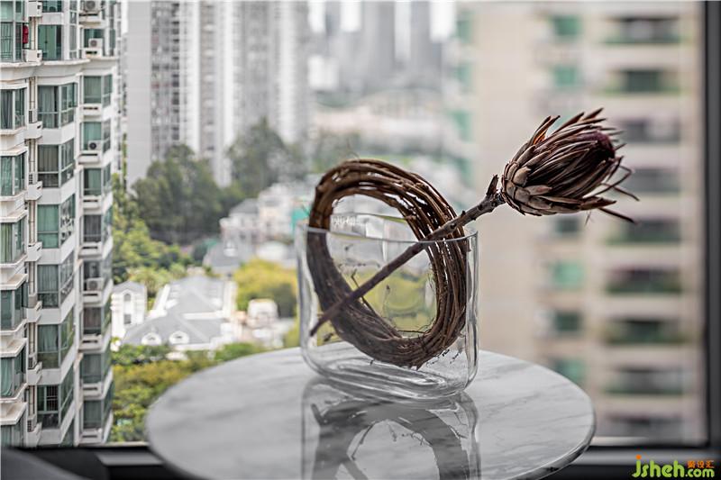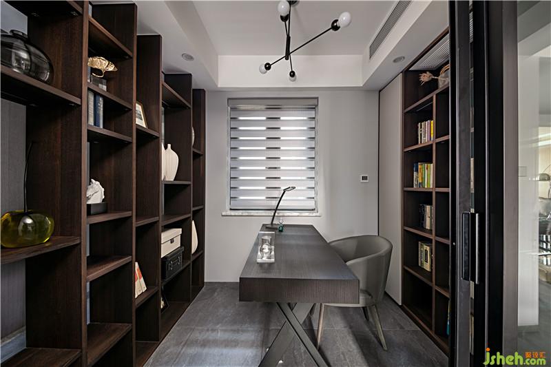 設(shè)計(jì)師利用玻璃替代墻體,開(kāi)闊書房視野,讓光線透進(jìn)通道。無(wú)背板書架靠著玻璃,讓書房?jī)?nèi)外都能觀賞到書架上的藏書與藝術(shù)品,形成半開(kāi)放式書房。兩個(gè)通道和書房之間自然過(guò)渡,消除空間隔閡。