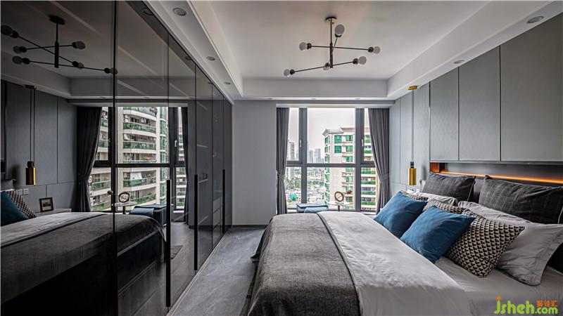 主臥中幾種不同材質(zhì)的碰撞,令整個(gè)空間的時(shí)尚感飆升。衣柜采用通頂灰玻平開(kāi)門式,占據(jù)一整面墻,正好與瓦灰床頭柜呼應(yīng),讓稍窄的臥室在視覺(jué)上擴(kuò)展了不少。