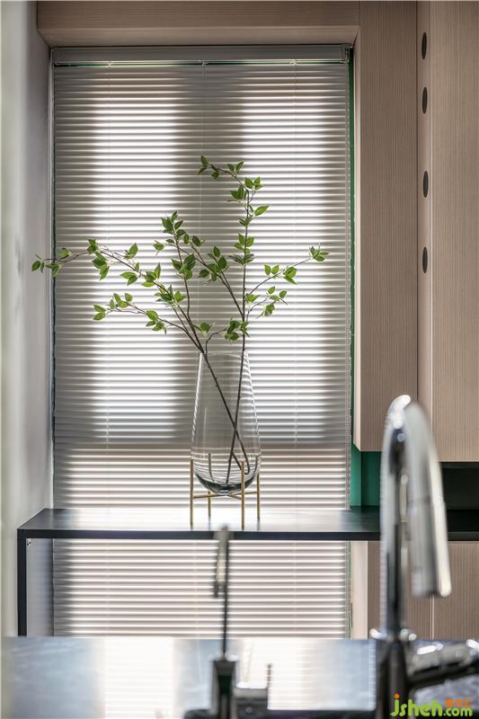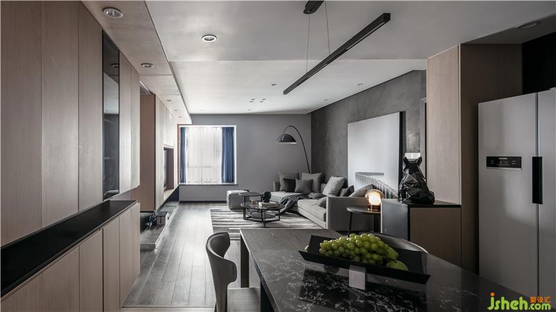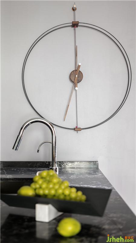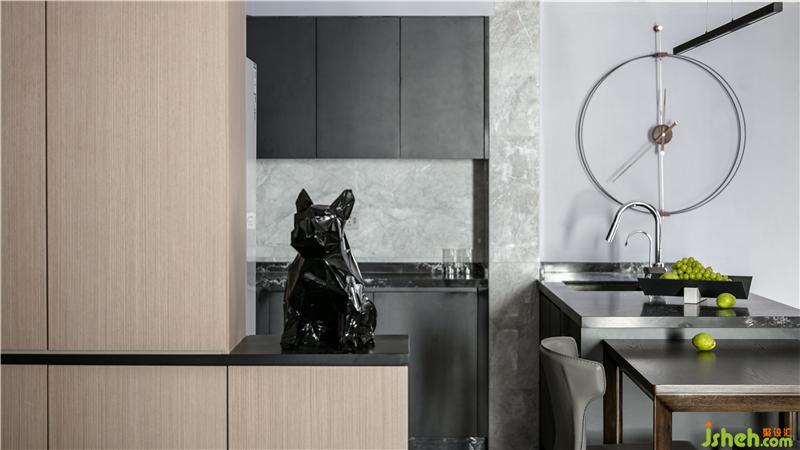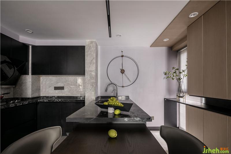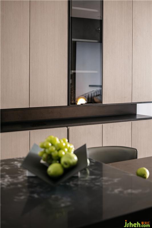 深灰色櫥柜與臺面的搭配運用,與客廳沙發(fā)背景墻在整個公共空間錯落的相呼應,會講故事的設計師得心應手以材料與色彩營造空間氛圍。