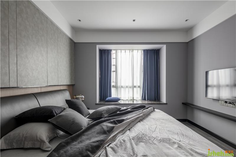 主臥延續(xù)公共空間的灰色與木色調,搭配沉穩(wěn)的藍色作為點綴,給空間帶來靈動的氣息卻不過分搶眼,內斂和諧。