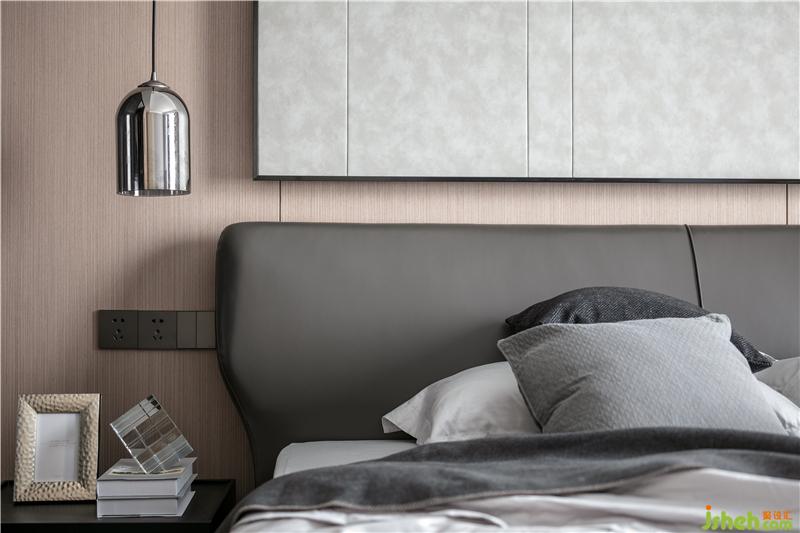 柔軟的皮質床與布藝床品、隨意“亂丟”的抱枕,與挺拔的床頭背景墻形成鮮明的對比;以淺色柔軟的床品營造靜謐、舒適的氛圍,讓居者負重前行的身體與靈魂得到徹底地放松。