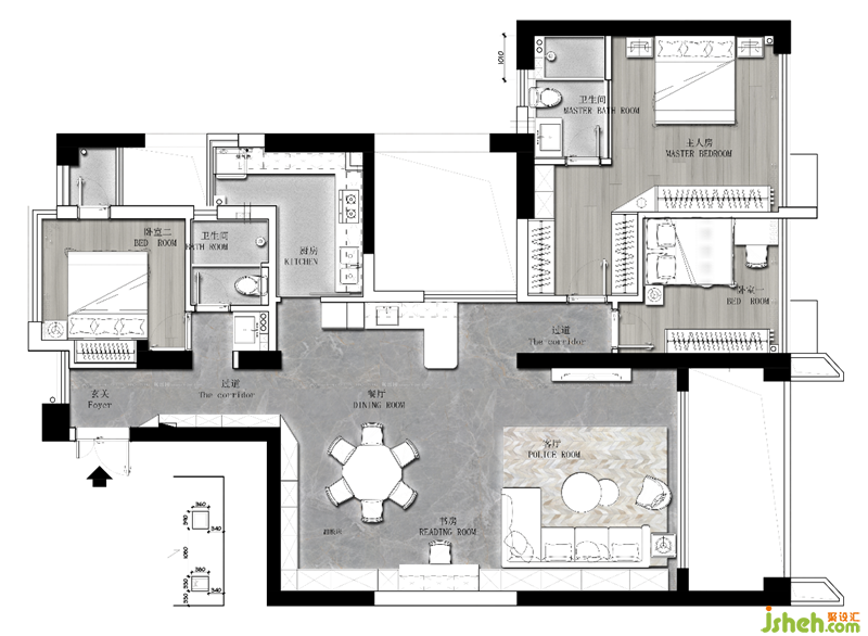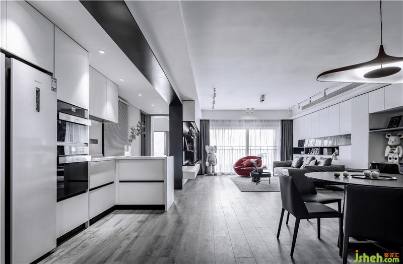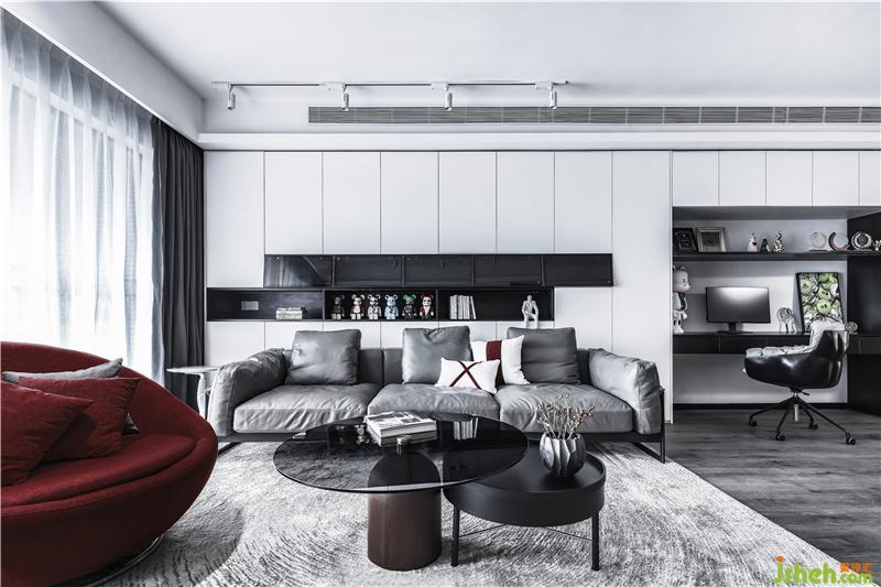 2、客廳、工作臺、餐廳三區(qū)一體,最大化利用空間,讓生活與理想兼容