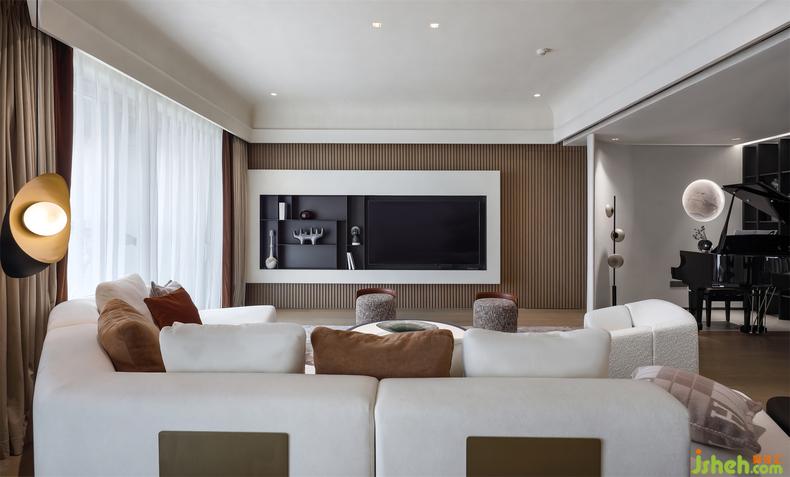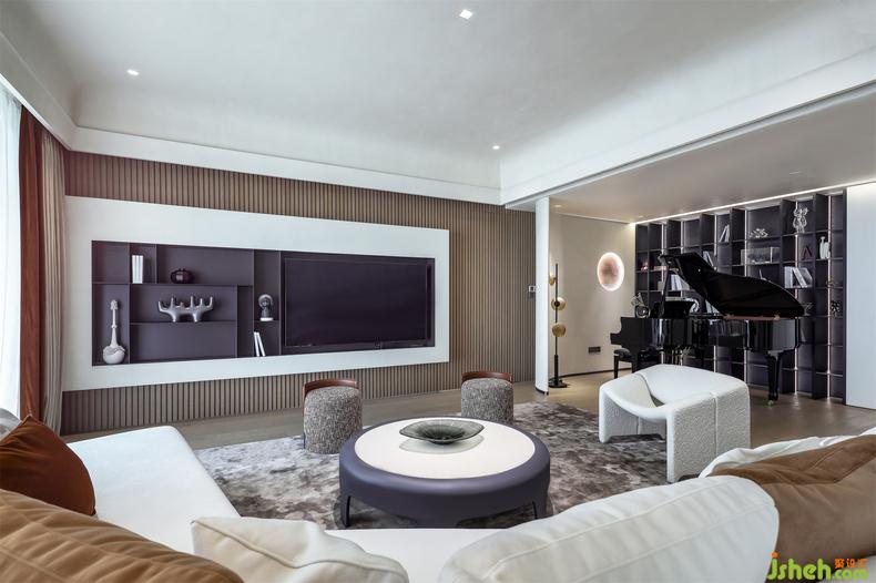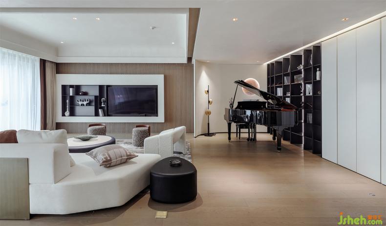 電視背景墻以黑白嵌入,擺滿書籍或者放置一些藝術品,都盡顯謙遜內斂,又對應著鋼琴的優(yōu)雅,充滿了藝術的趣味。