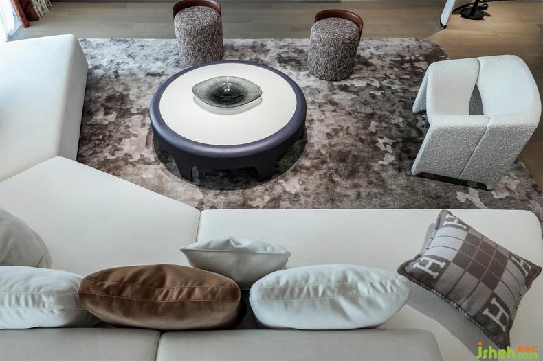 多邊形的沙發(fā)搭配黑色邊幾,點綴愛馬仕抱枕和延伸品牌最經典的大橘色系抱枕,深圳家居設計舒適的高級感最為令人著迷,再以圓形茶幾、極具設計感的單人沙發(fā)協(xié)調,簡約又給予豐富的享受。