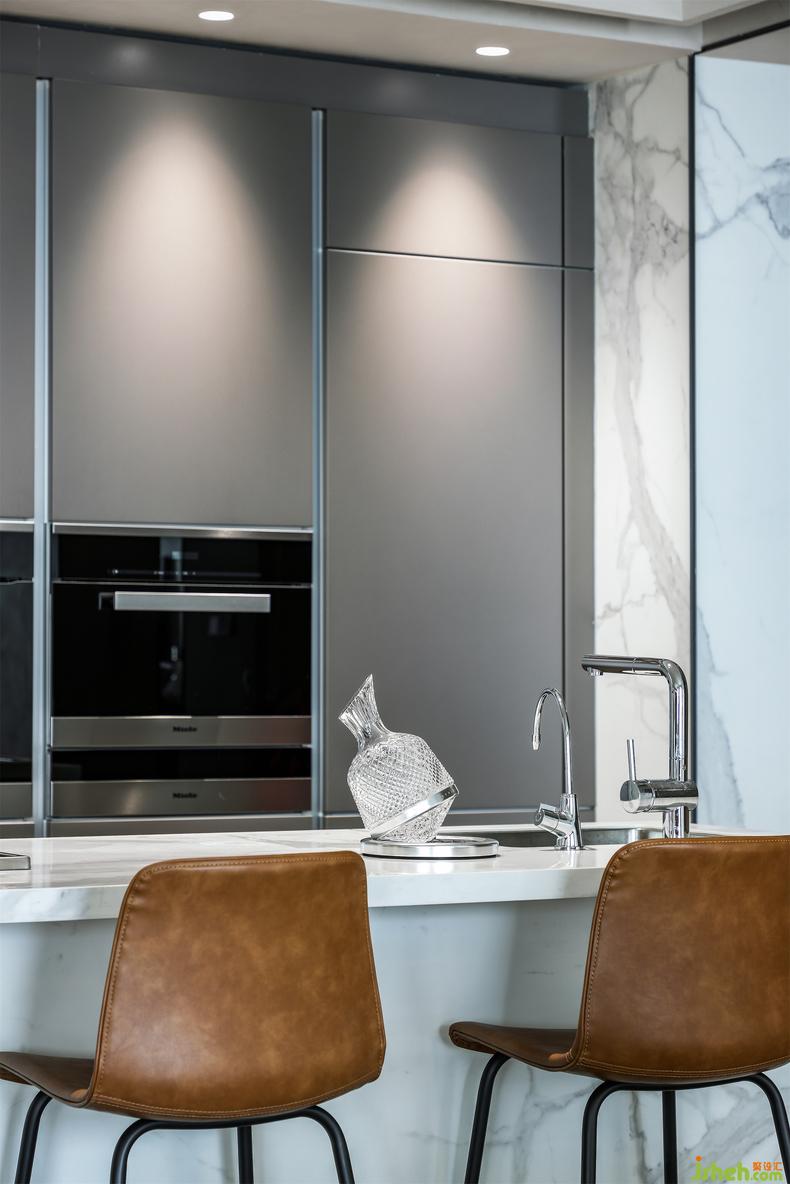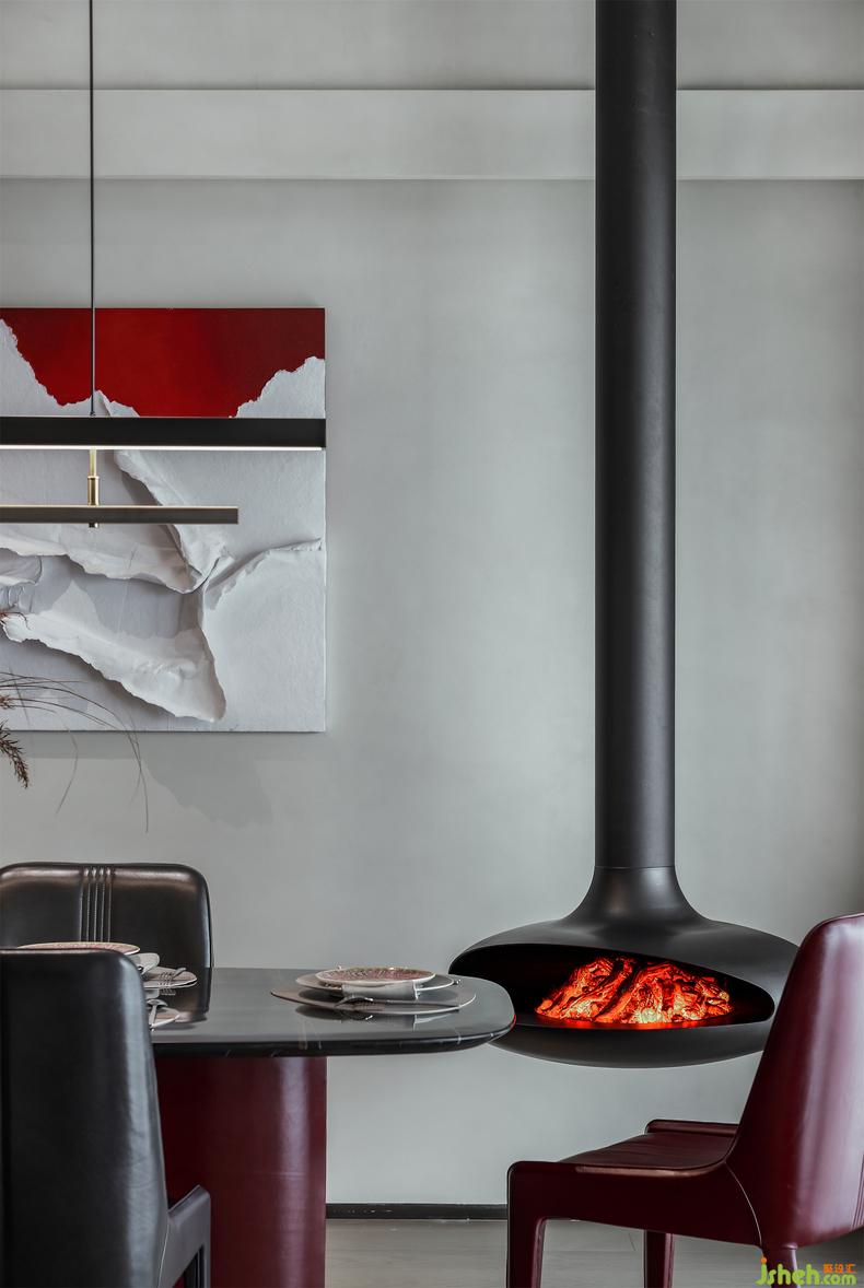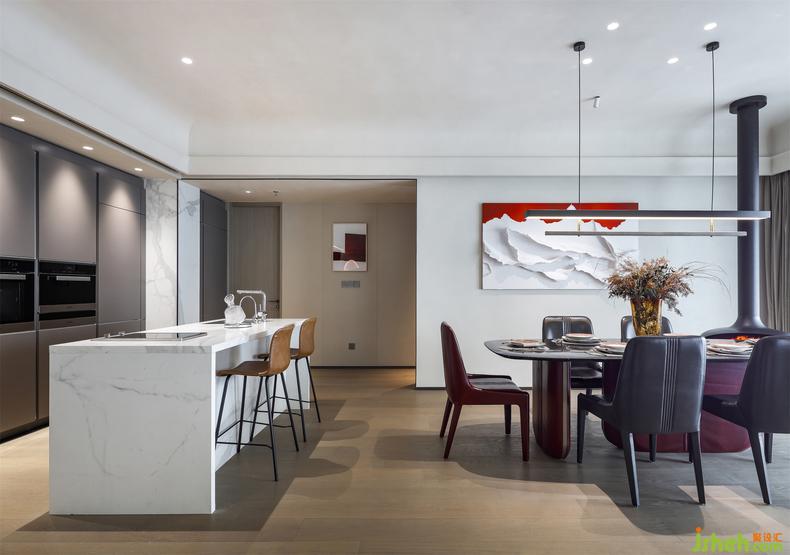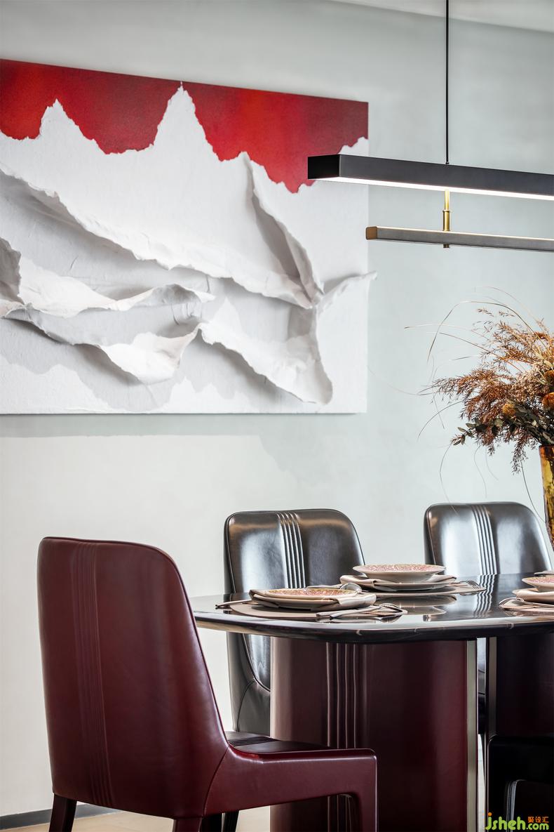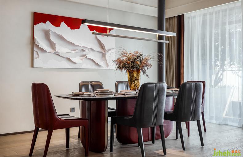 此外,酒紅色皮革的座椅,抓住了人們的視野,還抓住味蕾的美妙,深圳家居設(shè)計(jì)因?yàn)樯?、材質(zhì)與貼合身體的線條設(shè)計(jì),搭配深邃的黑色巖板餐桌桌面,令人心安且愉悅。
