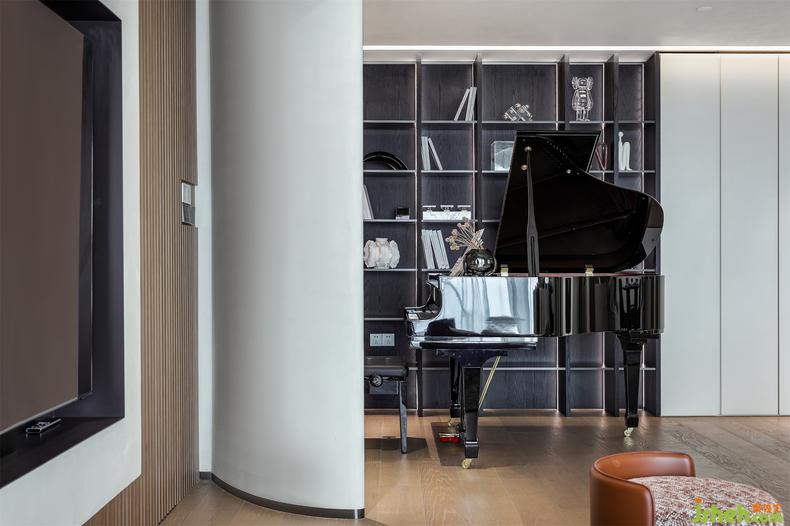 在拱形立面的一面是進(jìn)入主臥的隱形門,有半隔斷的作用,另一面環(huán)抱著音樂(lè),給予空間無(wú)限流暢的感覺(jué),伴隨著晝夜、四季的更替,淡然城市的喧嘩、內(nèi)心的焦慮與煩惱,一幅充滿冒險(xiǎn)精神的“火星”畫(huà)飾,一曲爵士/一曲藍(lán)調(diào),瀟灑自在。