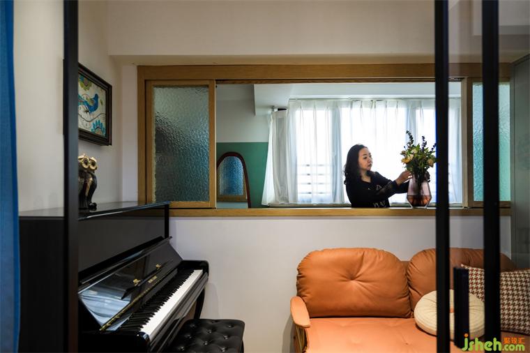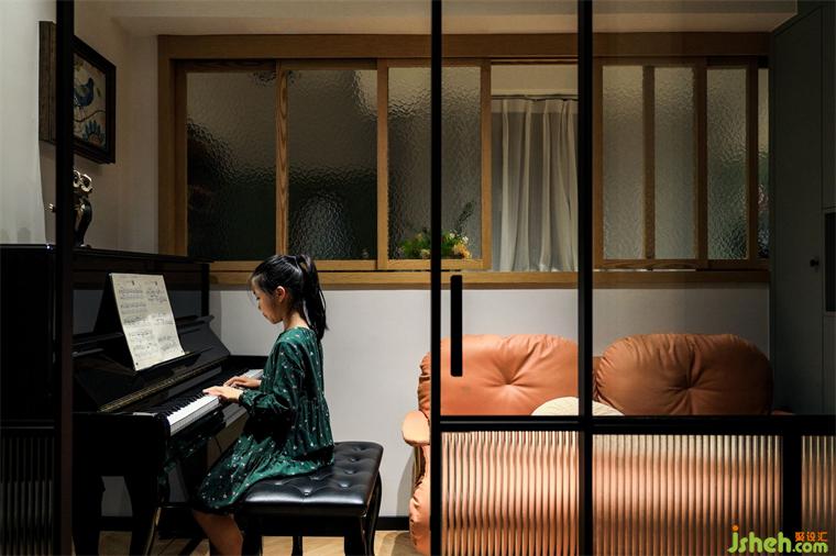 這個空間以前是客臥,沒有光線,通風(fēng)不好,現(xiàn)在改成半開放的琴房,木框窗從兩面看,都像是把空間裝在了一幅畫里:《插花的女主人》、《練琴的孩子》,有時候發(fā)呆、閱讀、休息,極具包容性和互動感。