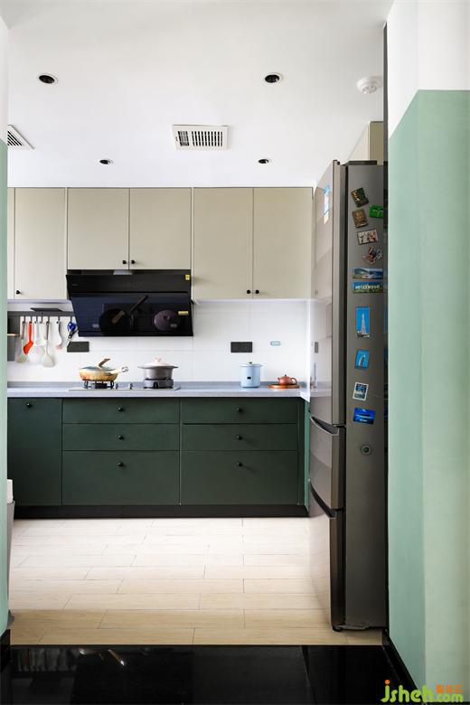 廚房的磚面、臺面也保養(yǎng)的很好,舊房改造設(shè)計重新搭配了顏色,換了柜門,就這樣簡簡單單,卻充滿力量。
