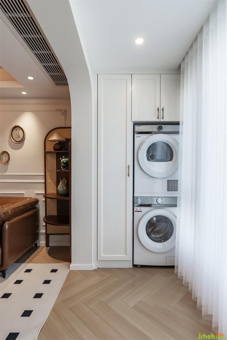 4.作為客廳與廚房分界的島臺,也可作為餐桌和吧臺使用,開啟不一樣的居家生活場景。除了島臺,廚房與客廳還以地磚與地板的鋪貼作為劃分,斜拼小奶油色磚耐磨耐潮濕,廚房難免油污與食物殘渣,地磚的光滑表面也更易于清潔。