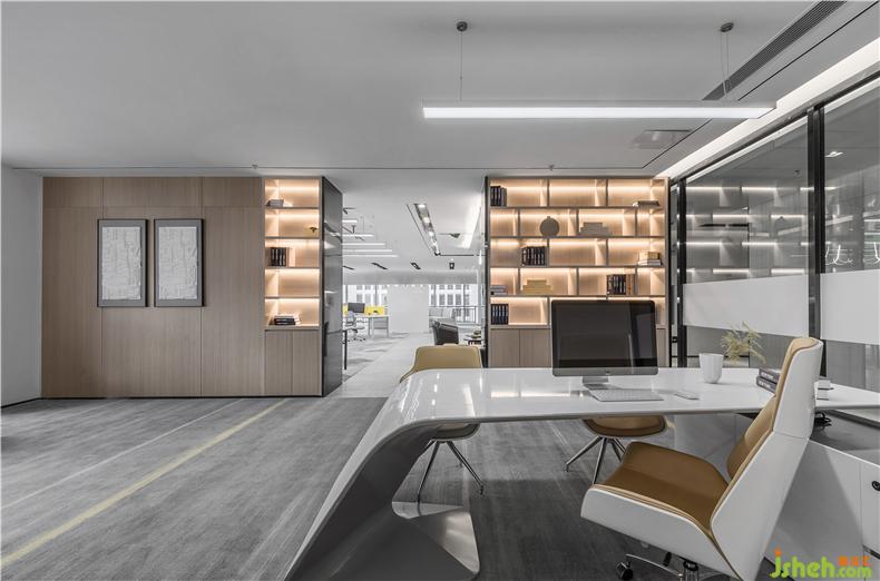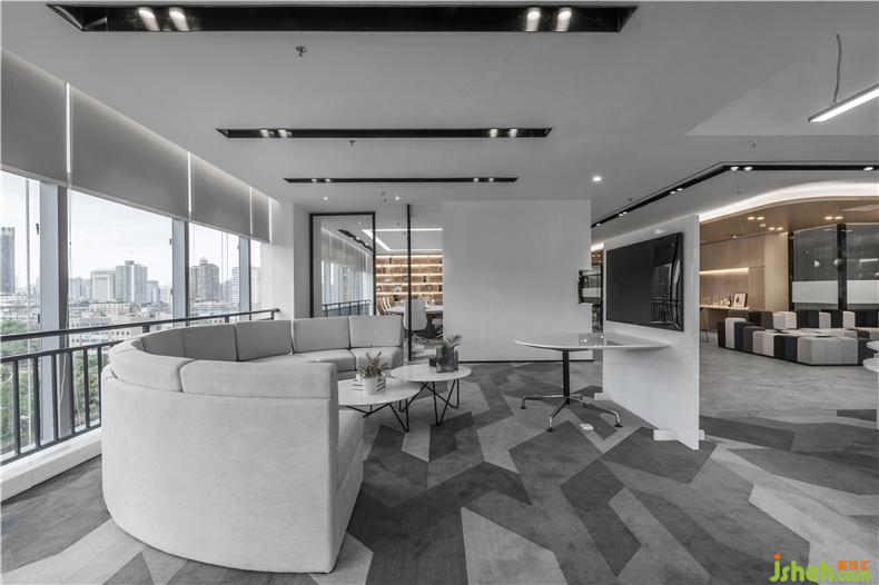 公共辦公區(qū)的設(shè)計,現(xiàn)代辦公桌的線狀與色調(diào)帶來強烈的視覺沖擊,辦公室設(shè)計線燈方格置物架以小型圖書角的姿態(tài)靜立在窗邊一隅,皆是推動人們高效工作的氛圍助力,科技感與未來感達到了統(tǒng)一。