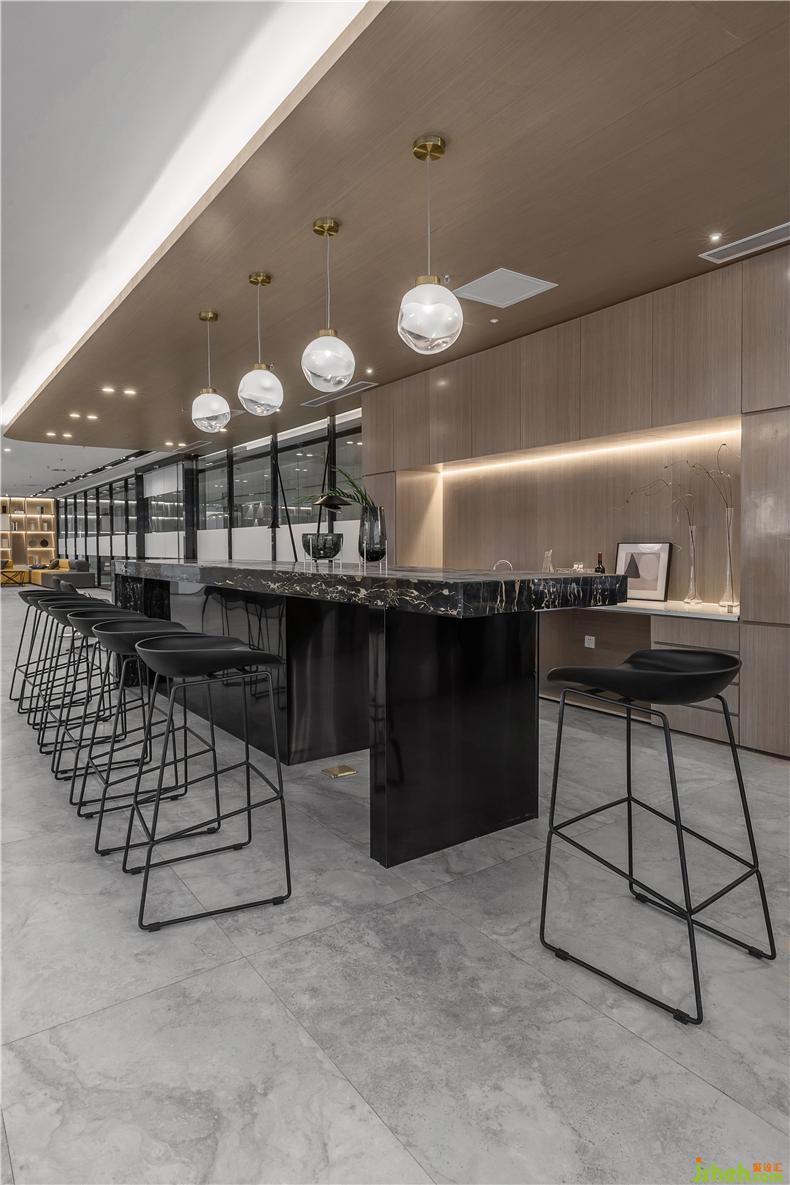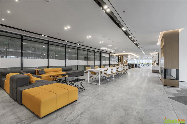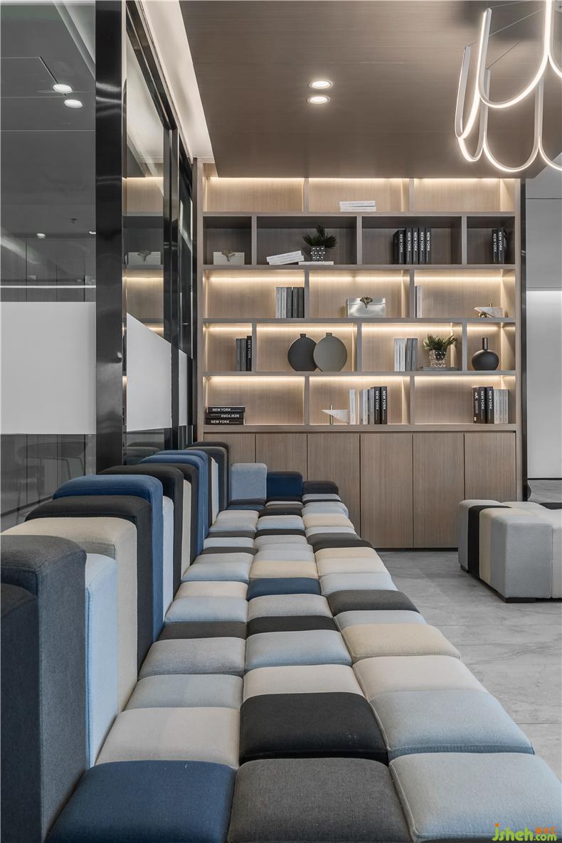 洽談區(qū)、水吧臺合理有序的排列,構(gòu)筑出一個自由開放的場域,空間整體以大幅純粹的顏色搭配營造強烈的視覺感,設(shè)計借助簡潔凝練的藝術(shù)語言,運用幾何線條營造不拘一格、活力流動的至高質(zhì)感,辦公室設(shè)計延展出空間流線型的視覺縱深體驗,詮釋科技元素與空間融合交匯的氛圍,清澈而純粹,此處作為員工和來訪者智慧辦公和休閑洽談區(qū),辦公室設(shè)計通過弧形具有圍合感沙發(fā)組合,開放性的水吧配套,自然光線下的辦公狀態(tài)下,人呈現(xiàn)出更自由精神愉悅的精神感受,充分滿足體驗者對于可移動式辦公的即時性需求。