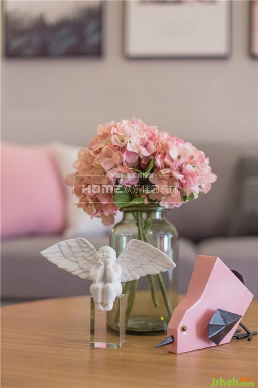 客廳室內(nèi)設(shè)計(jì)師選用了窄扶手的灰色三人沙發(fā)作為主沙發(fā),搭配浪漫別致的羽毛落地?zé)?,打造出溫暖舒適的空間氛圍,而粉色的單人沙發(fā)作為客廳跳色的同時(shí),也為空間增添了一絲時(shí)尚感。