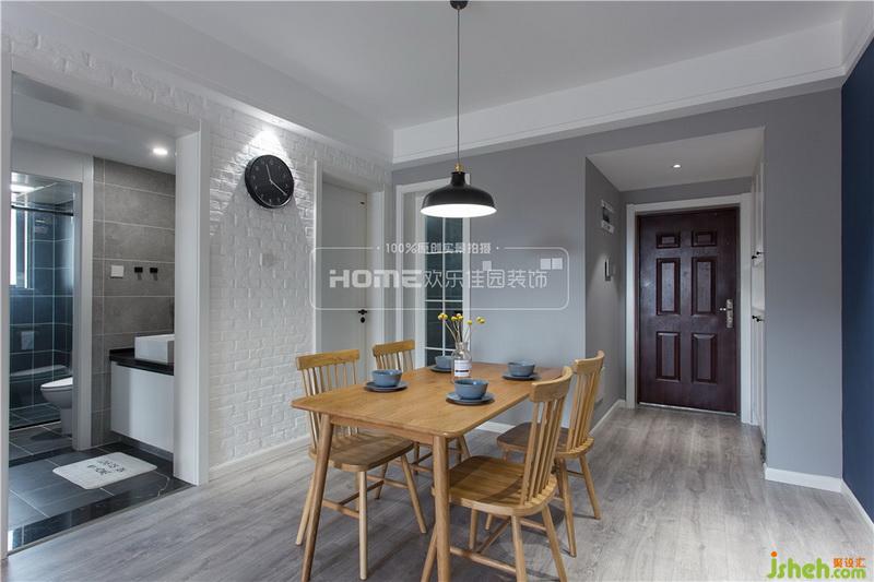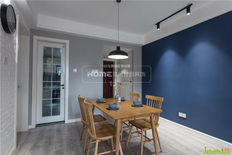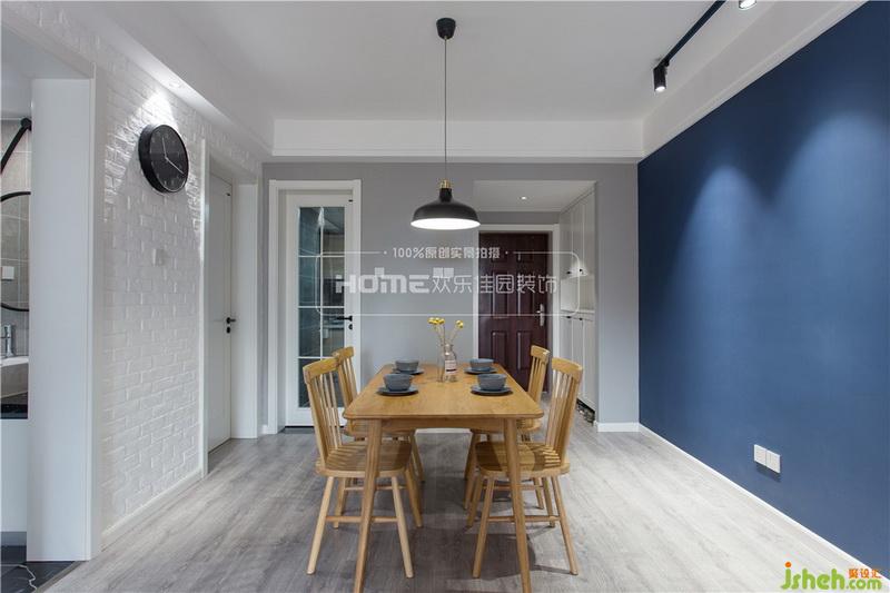 清新純凈的餐廳空間,室內(nèi)設(shè)計師延續(xù)了客廳自然簡約的風(fēng)格,一面藍(lán)、兩面灰和白、三點黑重組的空間,因造型簡單的原木色餐桌椅的加入,更具自然氣息。