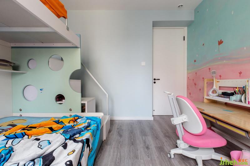 因?yàn)榧依锸莾蓚€(gè)小公舉,所以室內(nèi)設(shè)計(jì)師在色彩的搭配上,室內(nèi)設(shè)計(jì)師選用的是粉紅、淡藍(lán)色,活潑鮮艷,簡潔明快,具有童話的意境。室內(nèi)光線充足,簡單實(shí)用的書桌和儲物柜,讓兒童在自己的小天地里自由的學(xué)習(xí)生活。