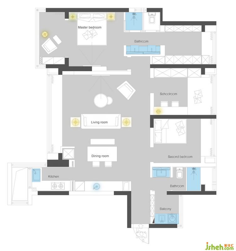 1、在整體結構布局上,我做了很多調整,通過電視墻外移來改動主臥的進門方向,增加臥室空間的私密性;
