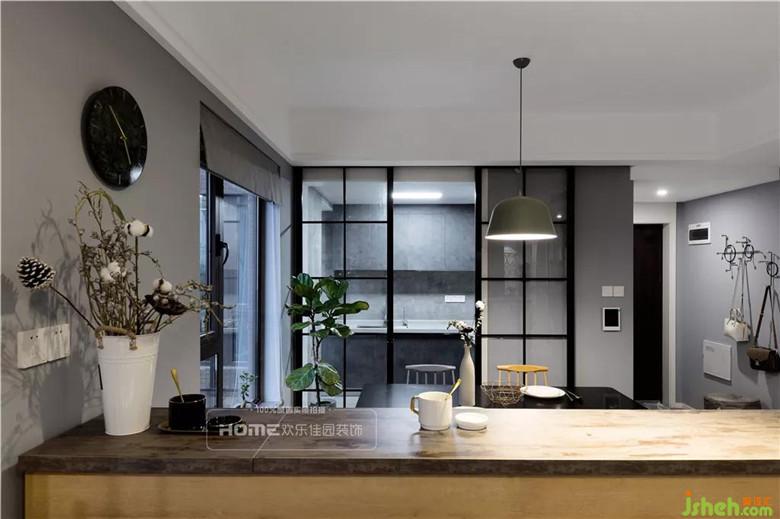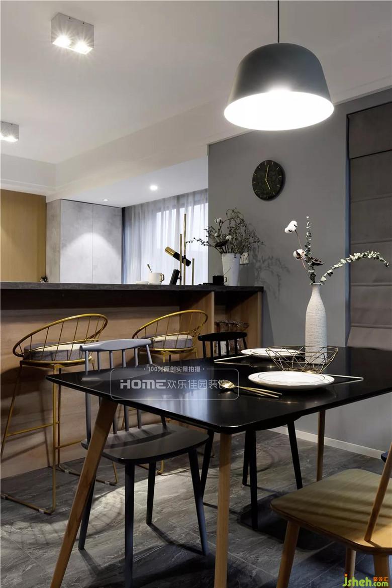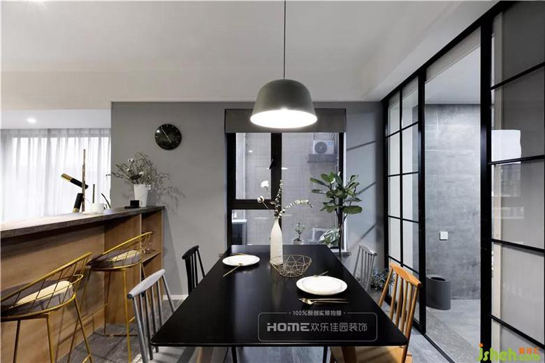 原始戶型的餐廳結(jié)構(gòu)墻多余,影響采光和通風效果,設(shè)計師將多余的墻體拆除,不僅增加餐廳空間的寬敞性,還大大提升操作空間。加之靜謐黑與灰,局部木色活躍整個空間。