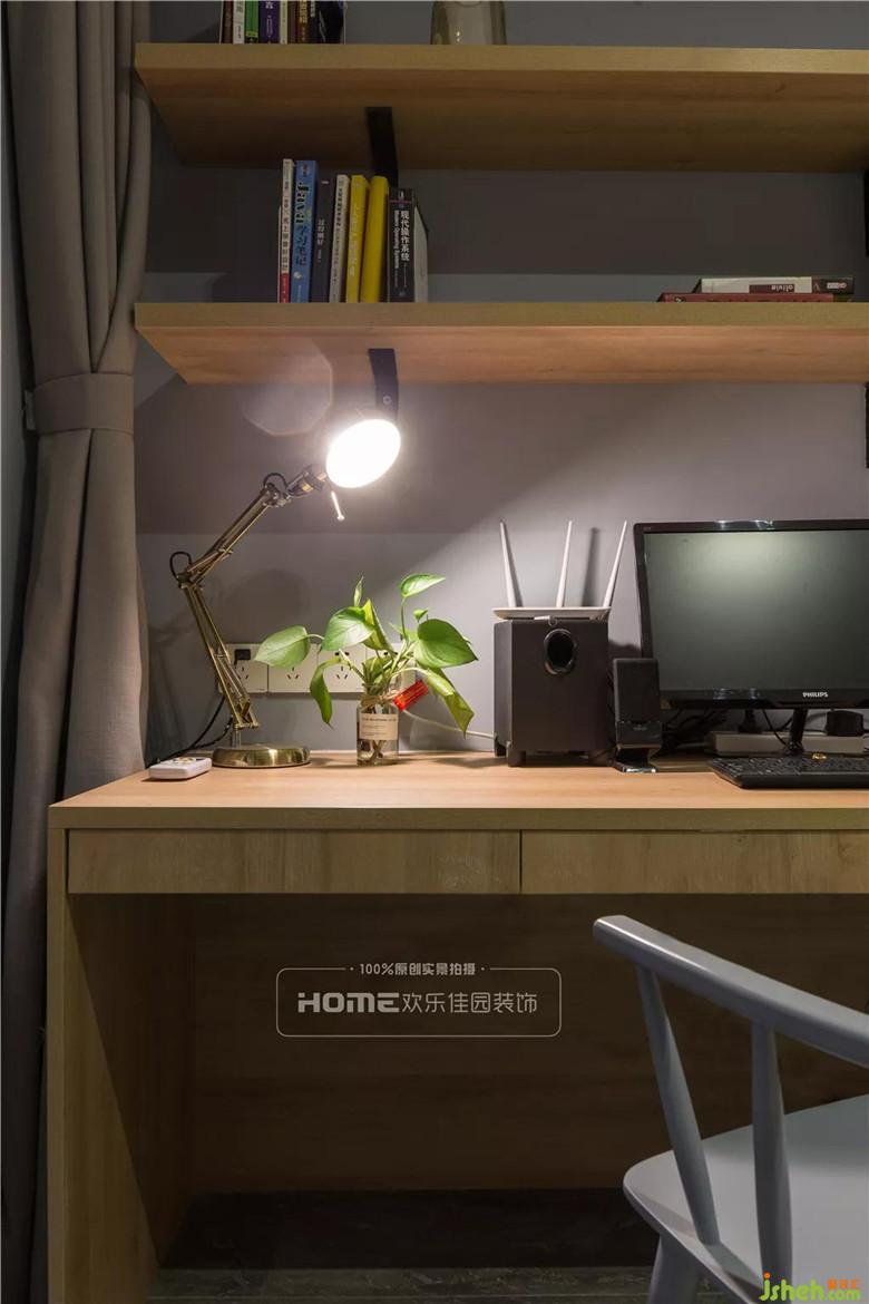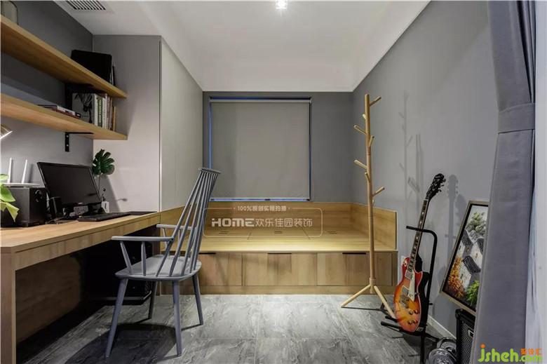 架高40公分的榻榻米,與書桌定制為一體,增加整體連貫性,上方和下方的畸零空間充分運用起來,收納儲物,美觀實用。