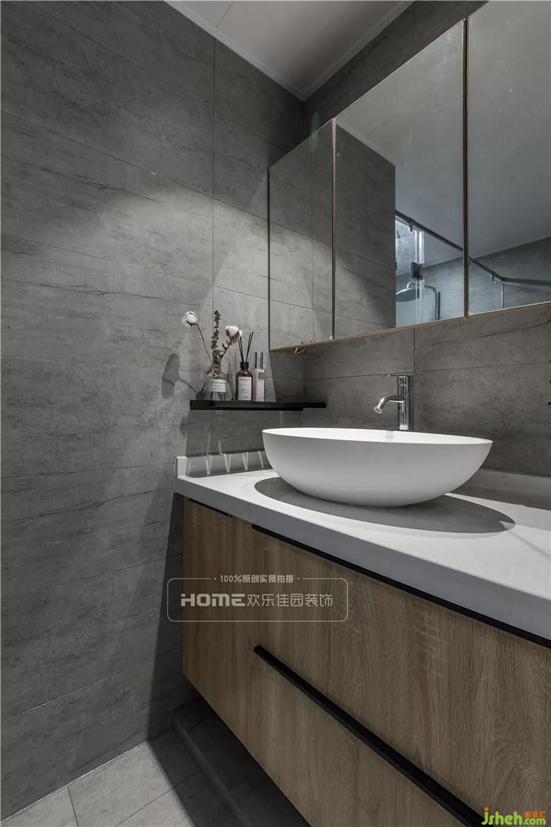 洗手臺(tái)上的大鏡子增加空間感,使衛(wèi)生間看起來不那么局促,灰色系墻磚看起來充滿時(shí)尚與創(chuàng)意,洗手臺(tái)下的大吊柜可以收納洗漱用品,收納功能強(qiáng)大又節(jié)省空間。