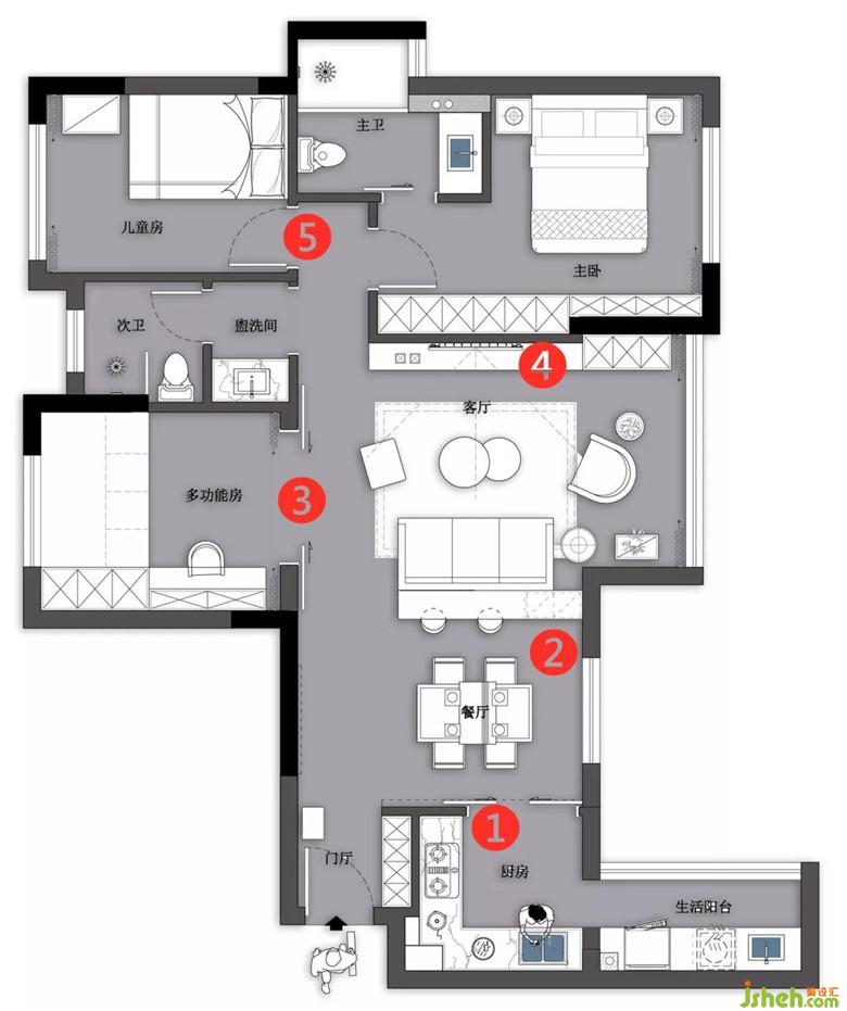加寬廚房門洞,設(shè)計(jì)成外掛于頂?shù)碾p推玻璃門,并以此定義空間功能,門內(nèi)吳先生柴米油鹽,門外吳太太琴棋書畫。