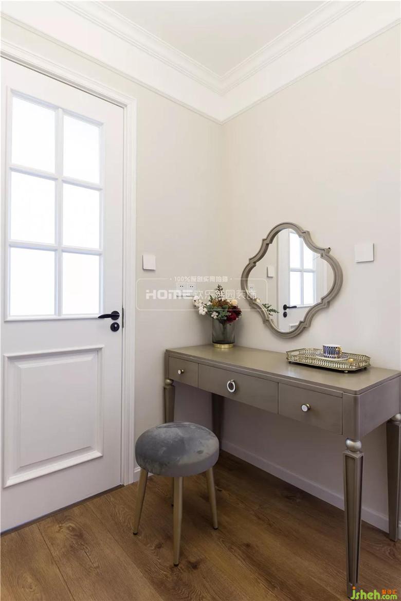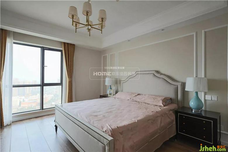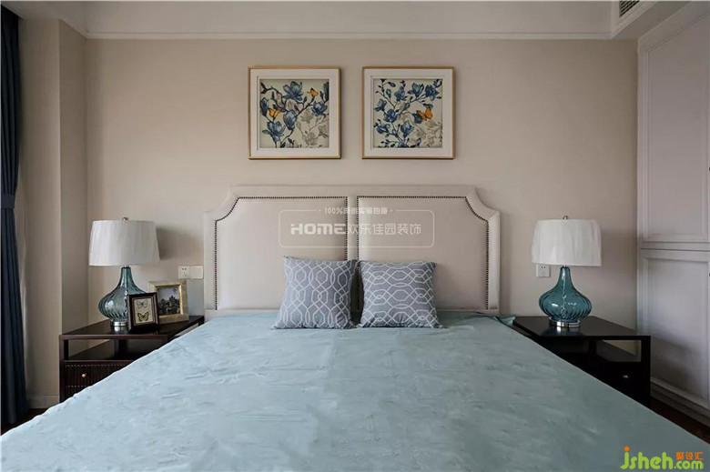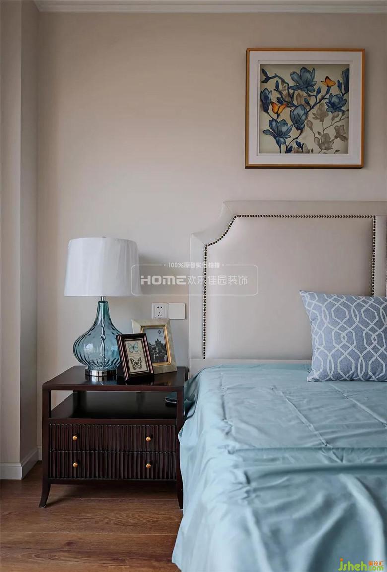 沒有設(shè)計(jì)頂燈,而是用溫馨柔軟的成套布藝裝點(diǎn),同時(shí)在軟裝和用色上非常統(tǒng)一。