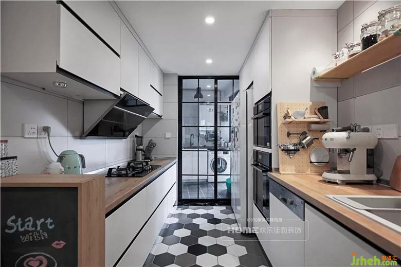 注重功能性的開放式廚房,櫥柜與墻面均用純凈素雅的白色打底,實木板臺面,巧妙的避開水、火,減少木飾臺面的損壞。不規(guī)則六角花磚拼貼方式,簡單流暢的幾何線條,營造輕松愉悅的備餐環(huán)境。