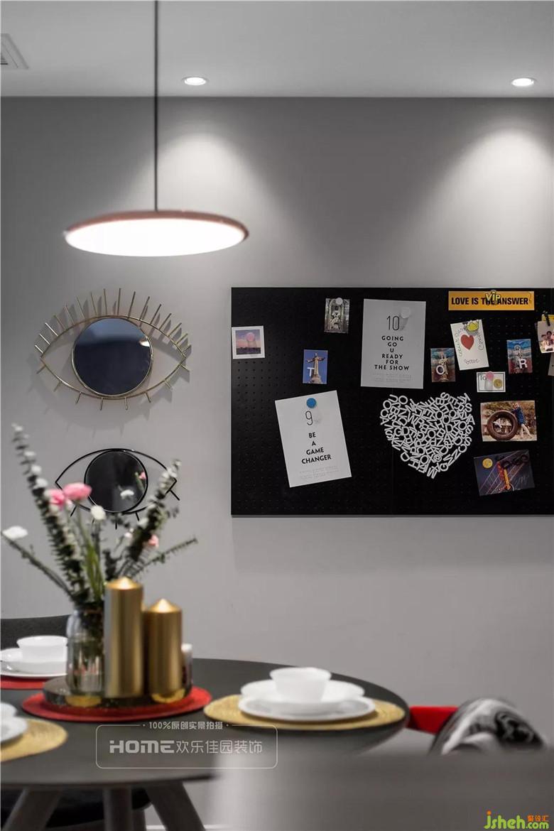 餐廳是整個戶型的熱點區(qū)域,三面連通廚房、客廳、休閑陽臺,視野通透,運用簡單而實用的操作臺劃分空間,設計師在別具巧思的安排下,更加注重空間情境的分享與交流。