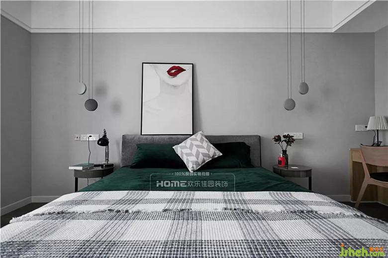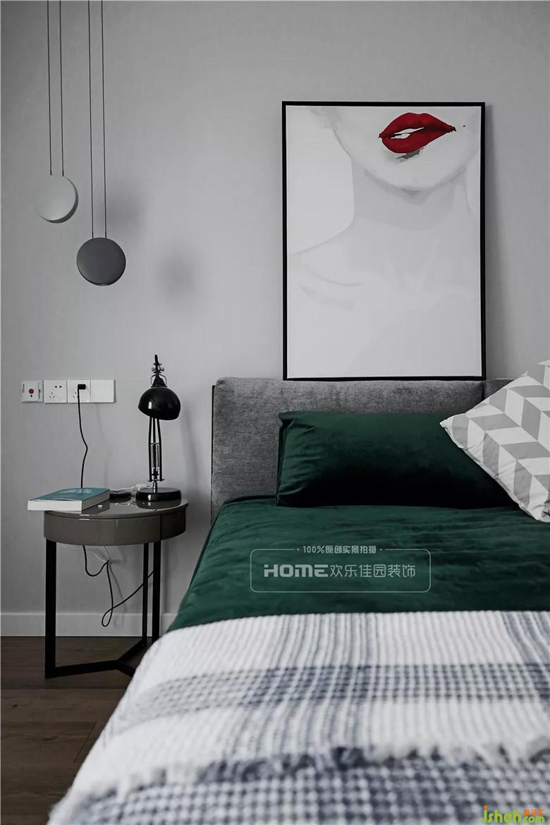 以簡潔的石膏板疊級線代替復雜的吊頂,以簡勝繁,從頂延直到床頭的照明燈,使室內(nèi)更具溫情。床品選擇穩(wěn)重的色調(diào)——墨綠色,活潑而富有朝氣,裝飾畫的大紅唇看一眼就讓人移不開眼睛。
