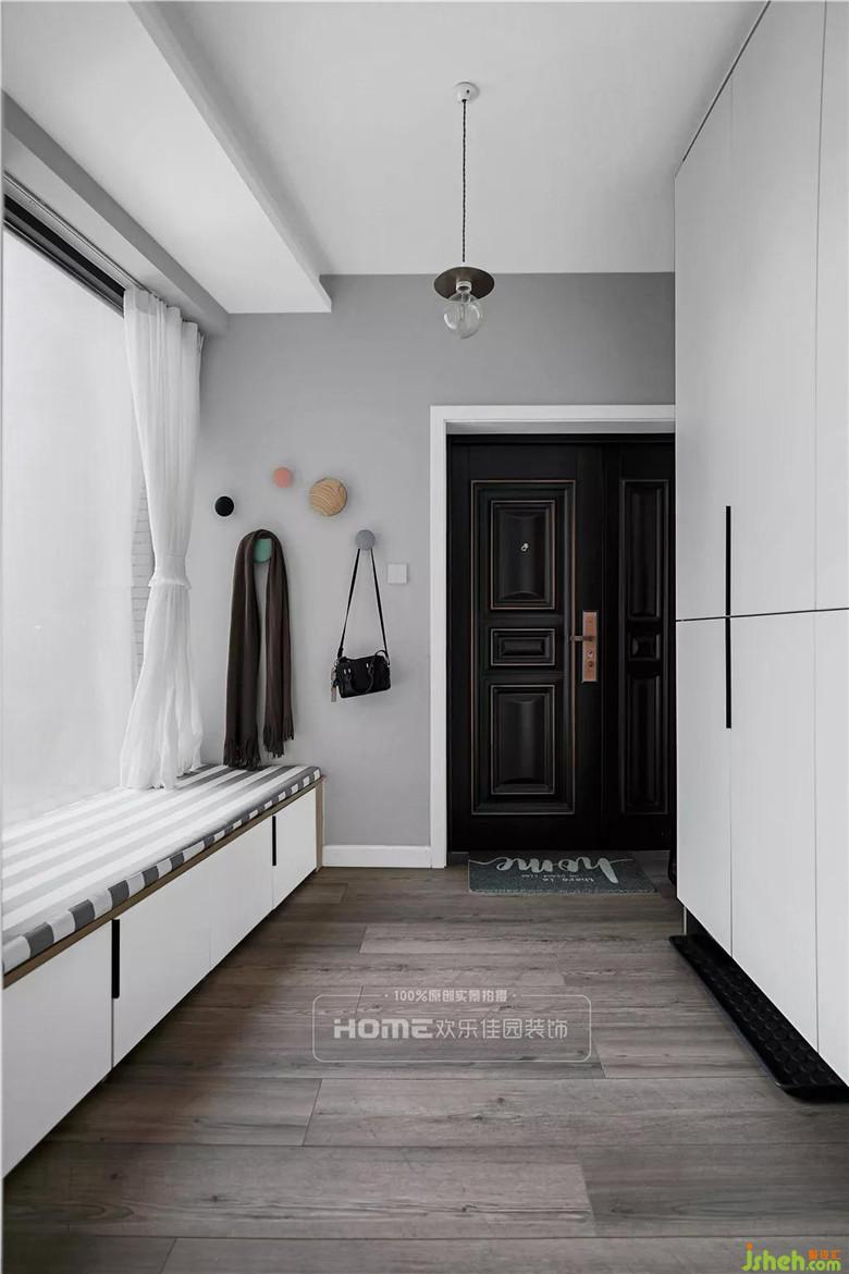 玄關(guān)區(qū)域?qū)挸髁?,空氣與光線的自然流通,靠窗的一面,設(shè)置低矮的收納柜,一舉兩得,既可以放置日常生活品,也可以坐下?lián)Q鞋;靠墻的一面設(shè)置儲物柜體,充分利用空間設(shè)計滿足家人的收納需求。