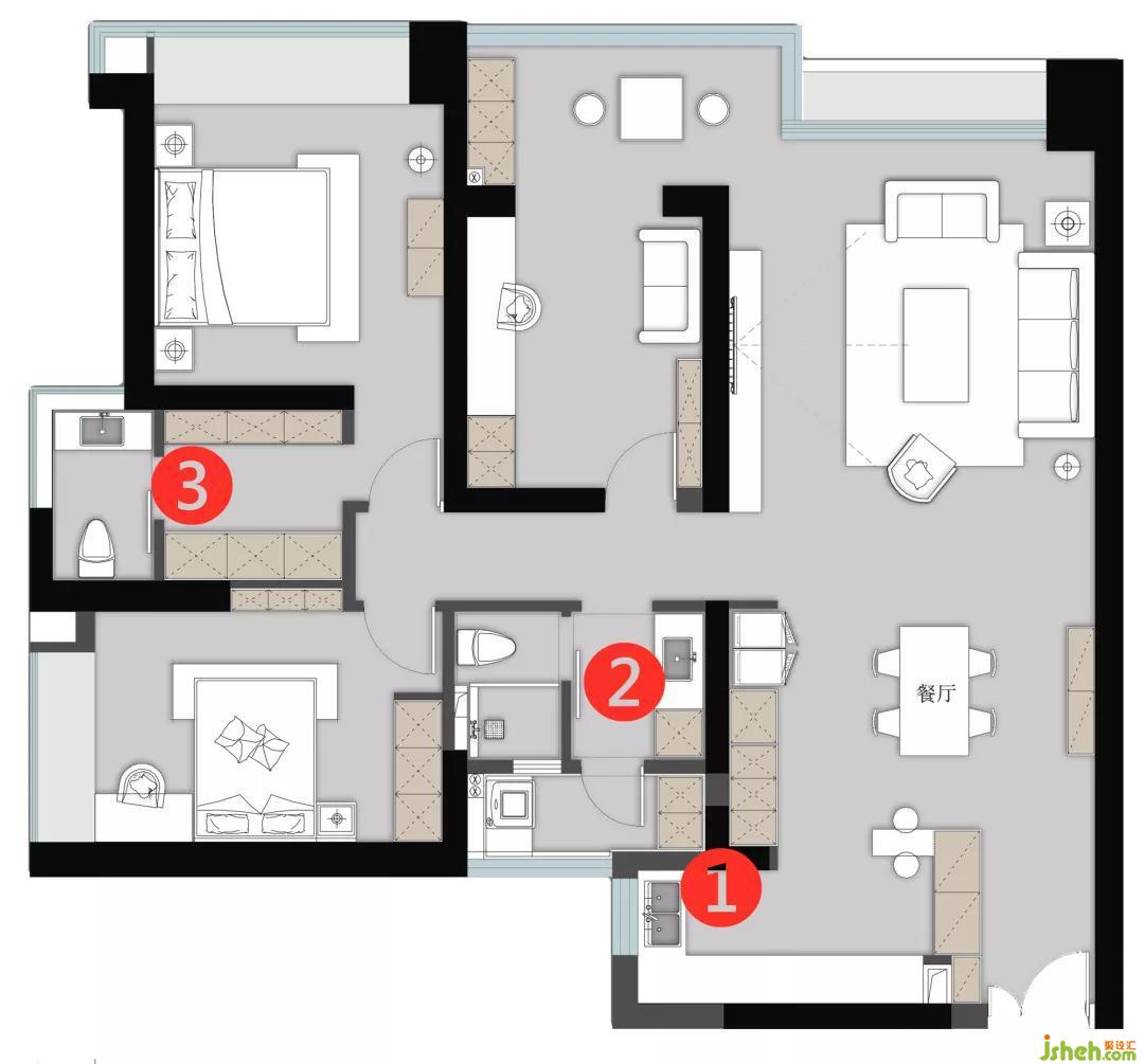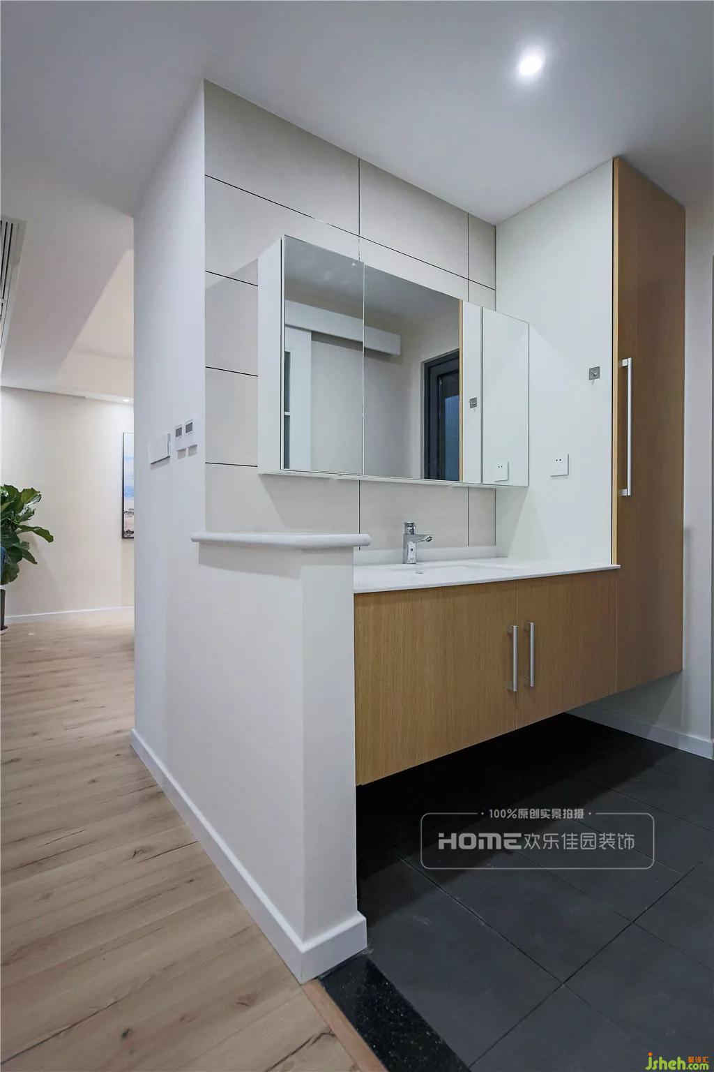 開放洗手區(qū)用了比較常規(guī)的材料和色彩搭配,合理的格局配置方便合理的人物動(dòng)線。L型的柜子更是滿足家人的收納需求,增添空間層次感。